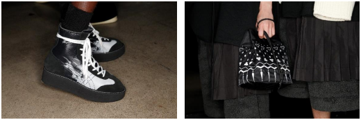全体的にシンプルでミニマルな統一感あるコレクションのなか唯一あしらった特徴的な装飾は、様々なアパレルアイテムの裾に施される炎とフラワーのプリント。ゴシック&ガーリー調でモダンなロックスター風のベロアのドレス、スカジャンへのオマージュ、そしてウエストにドローストリングを 施したミニドレス。これらのアイテムにナイロンジャケット、スムースもしくはボアのジャケット、同素材のマキシバミューダパンツ、ミディ丈のプリーツスカート、マルチポケットのベストをレイヤードし、頭部にはバラクラバをプラス。足元はレザーのパンキッシュなフラットソールのシューズ、薄いナイロンのキルティングのバルキーなプラットフォームソールのスニーカーも登場します。