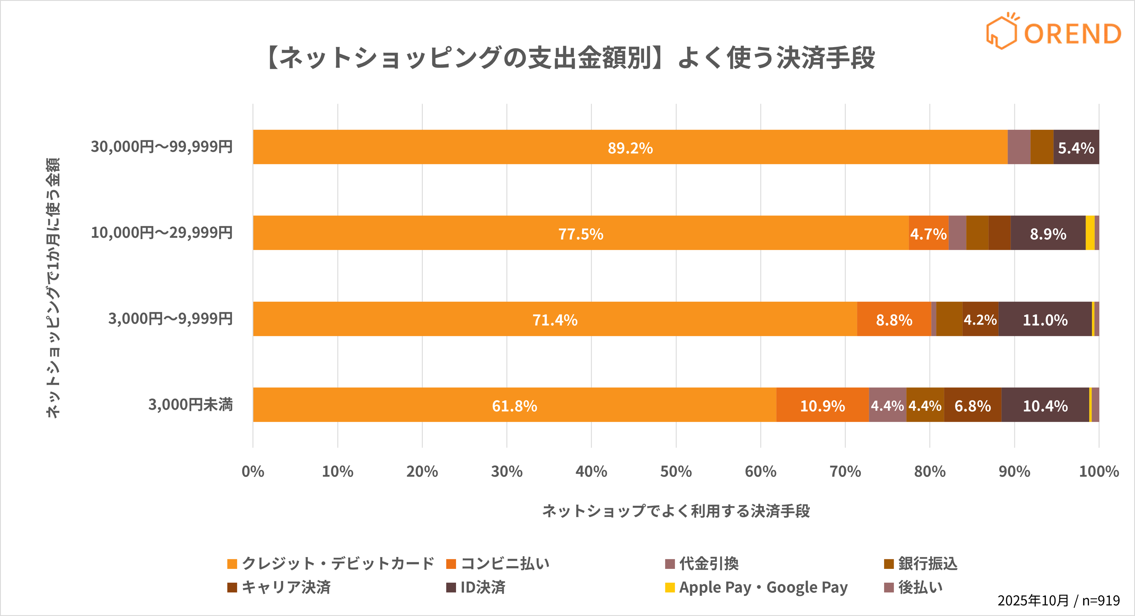 一方、「3,000円〜9,999円」の少額利用層では、ID決済やコンビニ払いの利用がやや多く見られます。スマートフォンで手早く支払えることや、少額でも使いやすい点が評価されていると推測できます。