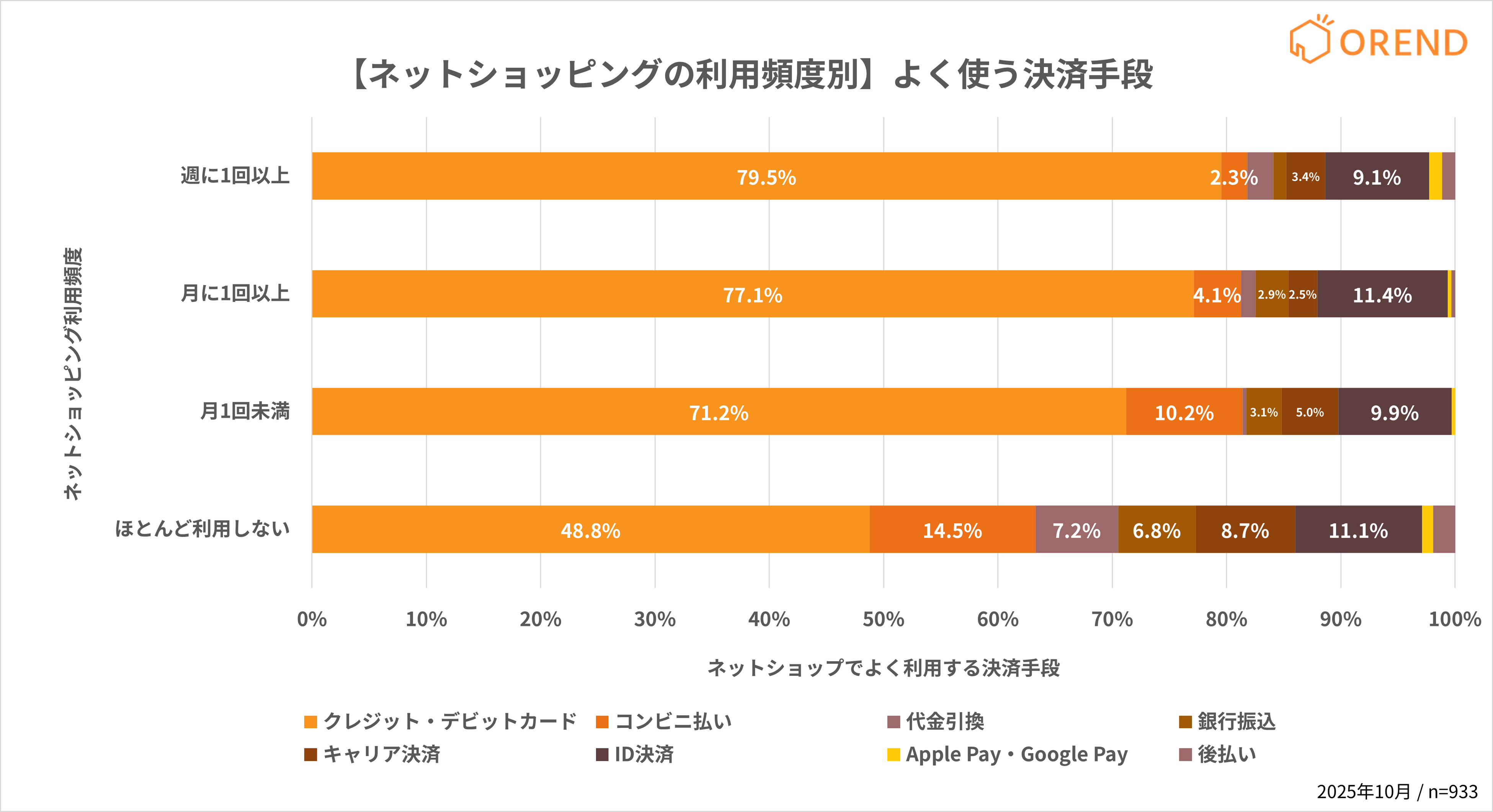 対照的に、ほとんど利用しない層ではクレジットカードは約5割にとどまり、コンビニ払いや代金引換など現金系決済が多く使われています。たまにしか使わない人には「オンラインでのカード情報入力に抵抗がある」「登録が面倒」といった心理があると推測されます。