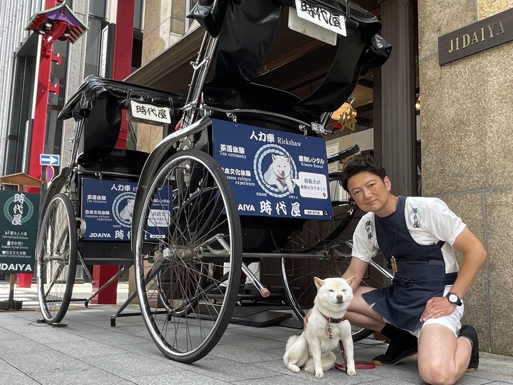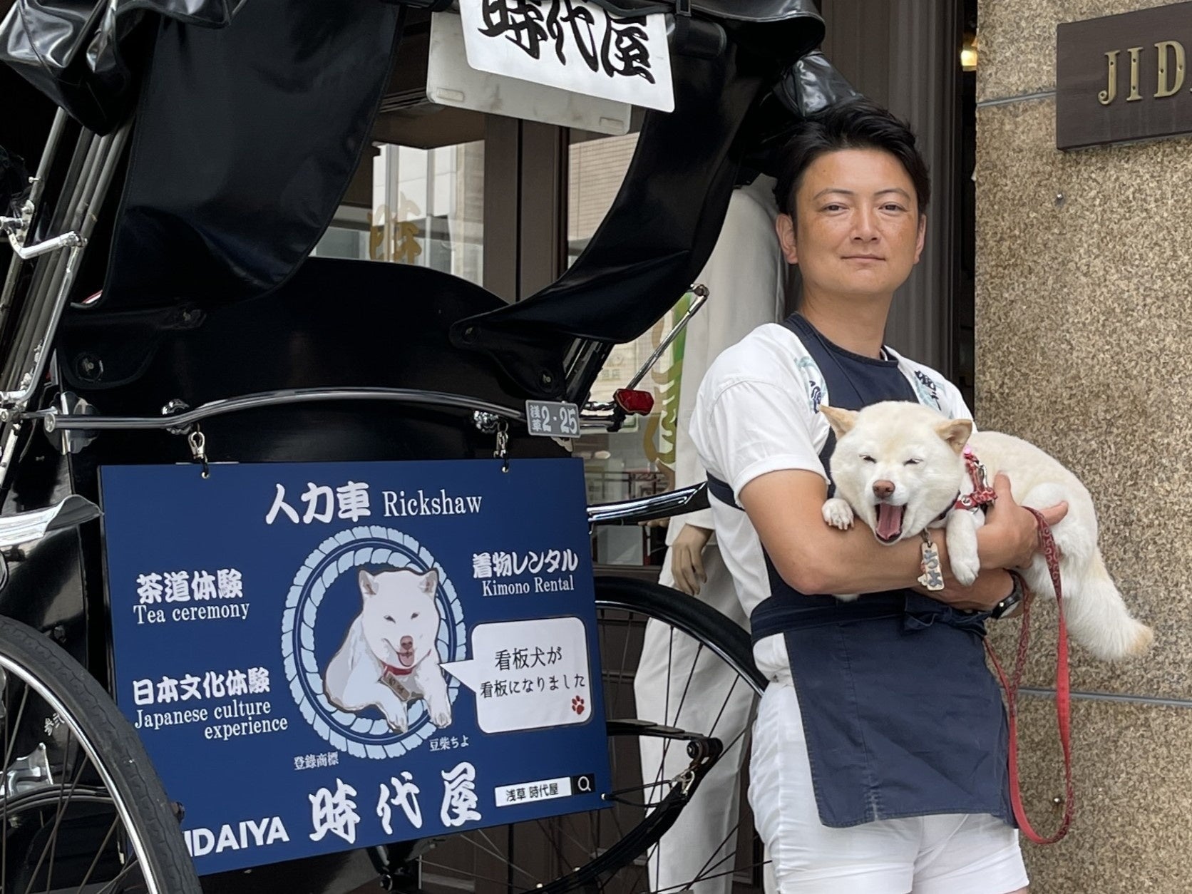 コロナ禍から回復の折から、時代屋は更なるインバウンド需要に対応するべく新たに着物レンタル専用の「別館」をオープンさせ、「豆柴ちよ」のロゴマークを入れた看板を設置するとともに、観光で使う20台の人力車の背面看板も「豆柴ちよ」のデザインに一新しました。初夏の浅草を「豆柴ちよ」の看板を付けた時代屋の人力車が颯爽と走り抜けます。