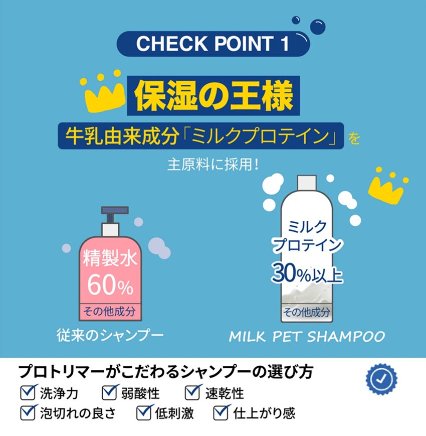 数あるシャンプーの中でも、保湿成分配合のMILK PET SHAMPOOは保湿効果を期待出来、安心して家庭で使用できると獣医師も推薦している。
