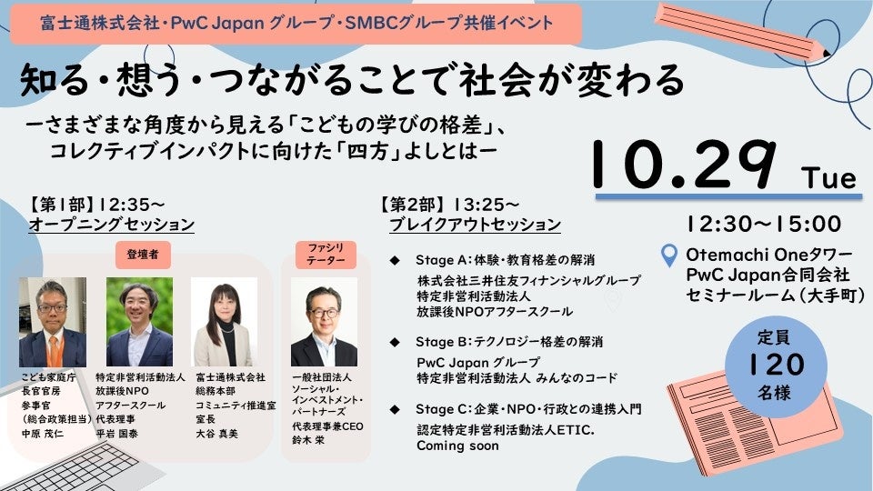 株式会社三井住友フィナンシャルグループ(執行役社長グループCEO:中島 達)と株式会社三井住友銀行(頭取CEO:福留 朗裕)、富士通株式会社(代表取締役社長CEO 時田 隆仁)、PwC Japanグループ*(グループ代表: 久保田 正崇)は、「こどもの学び(体験・教育)の機会格差」における企業の社会課題解決への参画を後押しすることを目的に、10月29日(火)にPwC Japan合同会社 セミナールーム(大手町)にて、イベントを共催します。