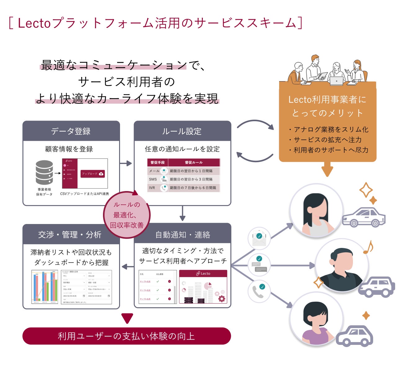 債権管理業務のDXを推進しているLecto株式会社(本社:東京都渋谷区、代表取締役社長:小山 裕、以下 「Lecto」「当社」)は、2023年1月より、中古車販売事業を展開する株式会社プラウド(本社:静岡県三島市、代表取締役:富田 久由、以下「プラウド」)と契約を締結し、Lecto独自のテクノロジーを活用した債権管理サービス「Lectoプラットフォーム」を提供開始したことをご報告いたします。Lectoはプラウドが提供する中古車の自社ローン販売事業における債権管理を効率化させることを通じて、ご利用ユーザーの支払い体験の向上をサポートしつつ、プラウドの業務効率化を支援いたします。