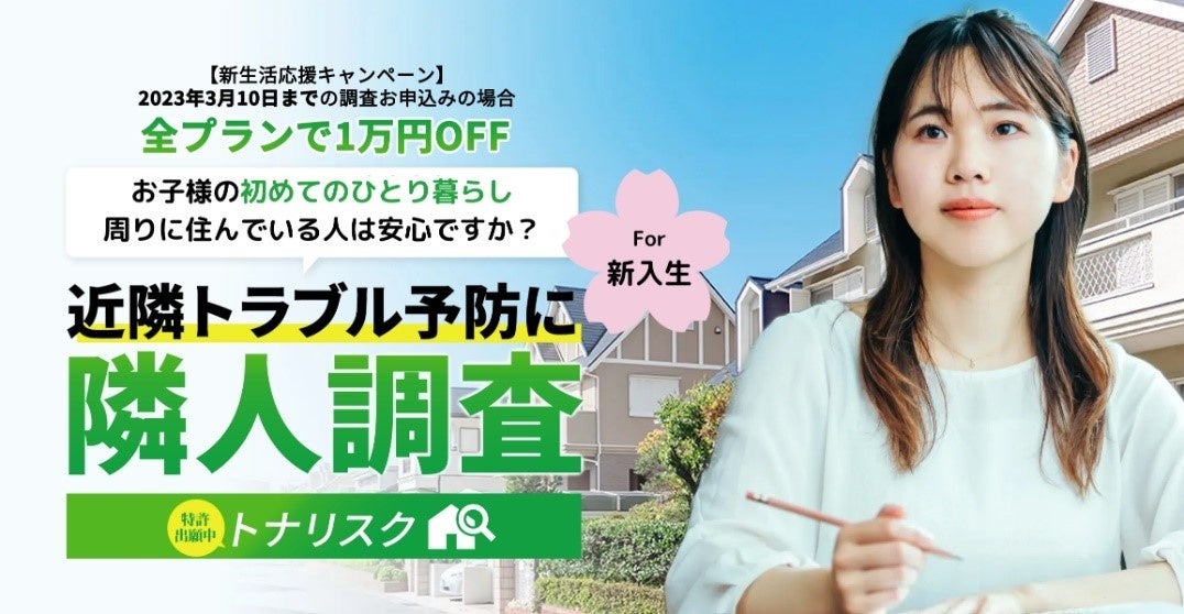 アンケート結果の第5位・第6位にも上がった「お子様のお住まいの隣人・近隣住民や環境はどうなっているのか?」への対応策として、トナリスクの提供する「隣人調査」の特別キャンペーンを開催中です。