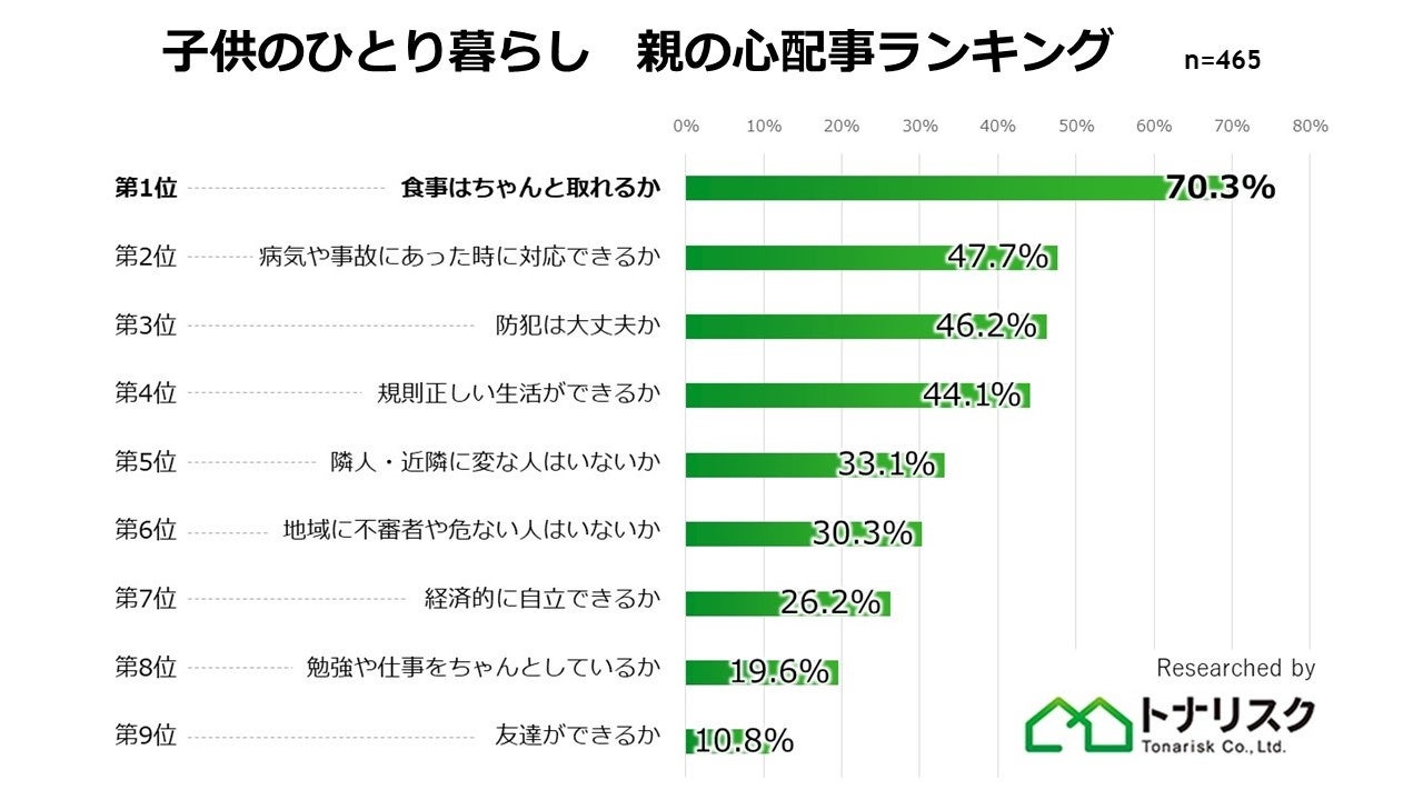 株式会社トナリスク(本社:東京都豊島区、代表取締役:松尾 大史)は、子供がひとり暮らしした経験がある親40~91歳の男女465名を対象に「子供のひとり暮らしの心配事」について調査しました。心配事の内容と、どういった対処、対応をしているかを尋ねました。