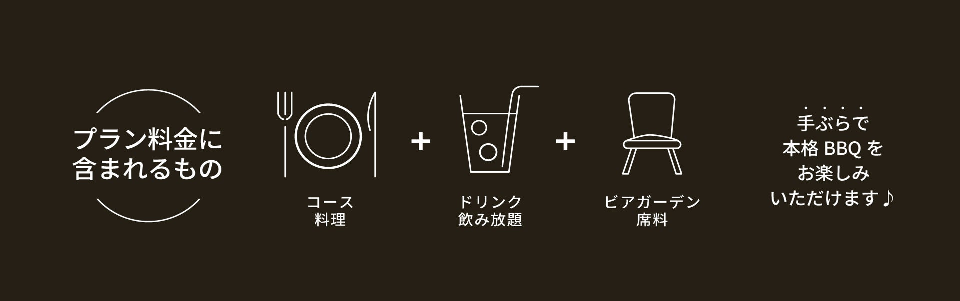 各種お飲み物はドリンクカウンターからフリーフローで自由にご利用いただけ、開放的な空間でBBQとビアガーデンを楽しみながらラグジュアリーなひと時をご提供いたします。