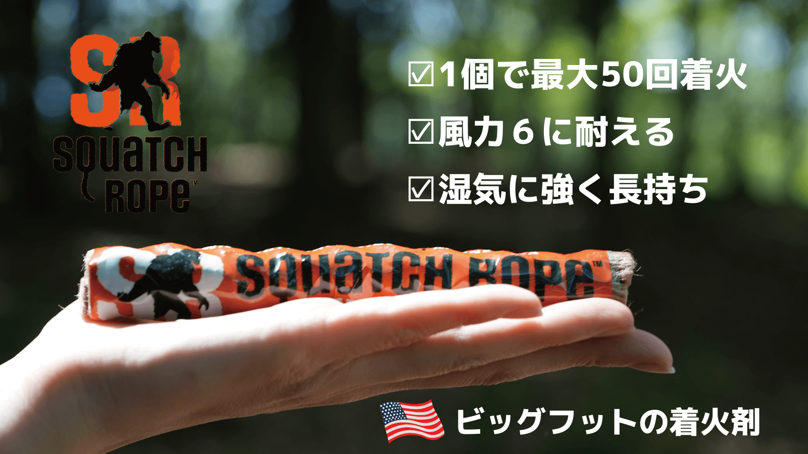 キャンプアウトドアの盛んなアメリカ・メイン州から日本に初上陸したSquatch Ropeは、天然麻というエコロジーな素材で作ったにも関わらず、耐水耐風仕様で着火力が強いのが特徴。