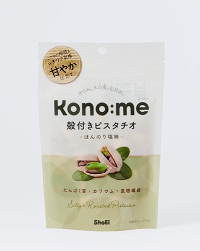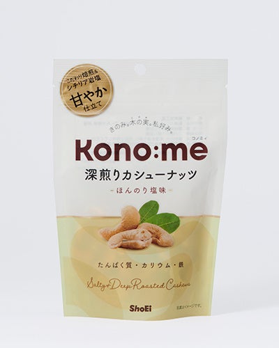 Kono:me(コノミィ)は、ナッツ・ドライフルーツ類を中心とした原料の調達・生産・加工・流通・販売を一気通貫で行うことを強みとする正栄食品工業株式会社が、専門商社でありながら製造工場を有している強みを活かし、原料・製法・味付けにこだわって製造しています。同社では、21年の新工場稼働に伴い、オリジナルの焙煎機導入を行いました。量だけでなく質もより向上した商品をより多くの方にお召し上がりいただきたいという想いから、同社での新規ルートとなる、菓子・加工食品チャネル商品となります。