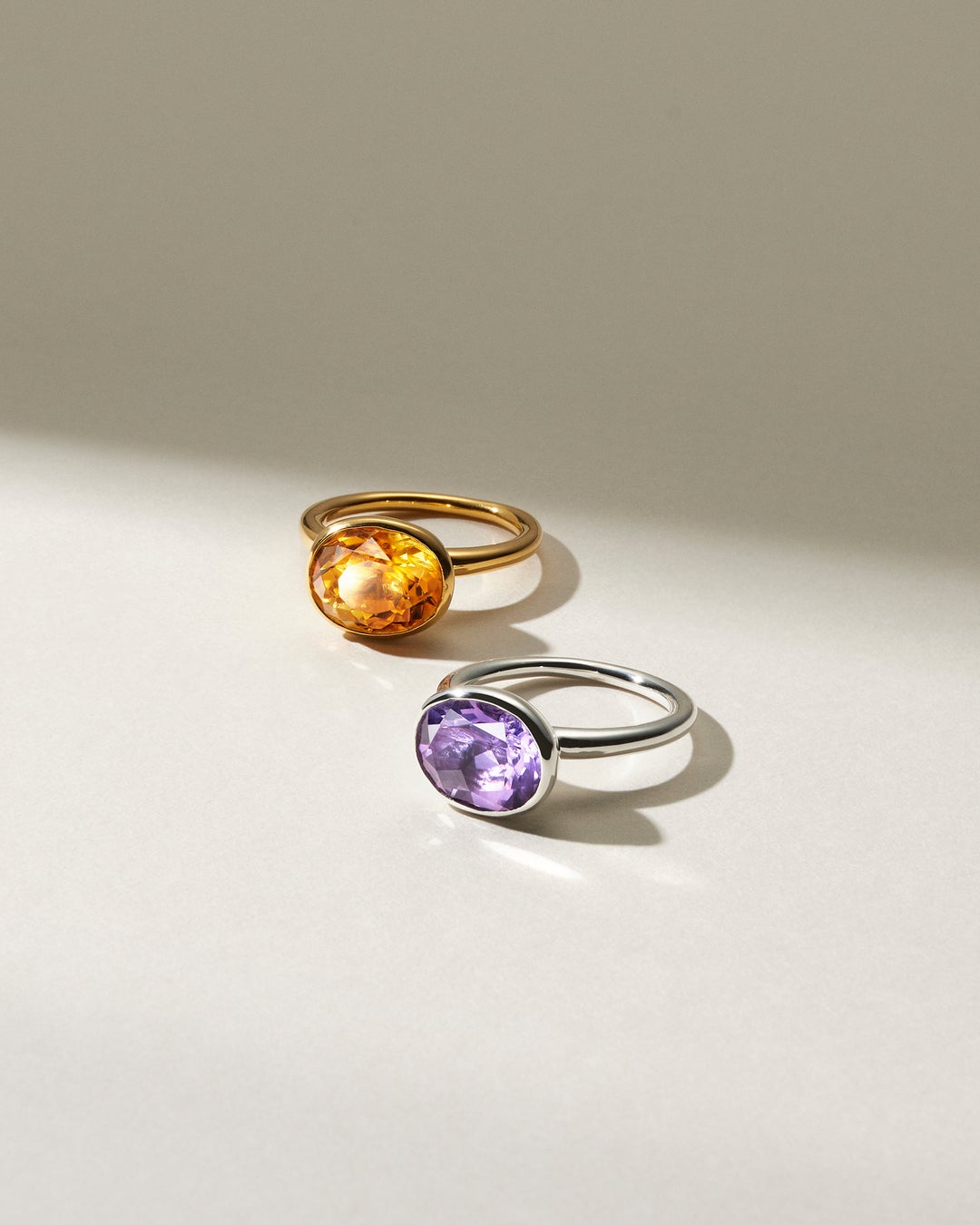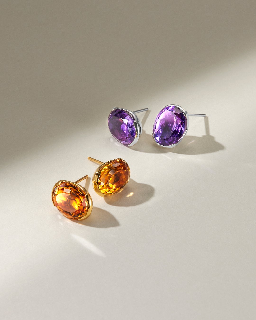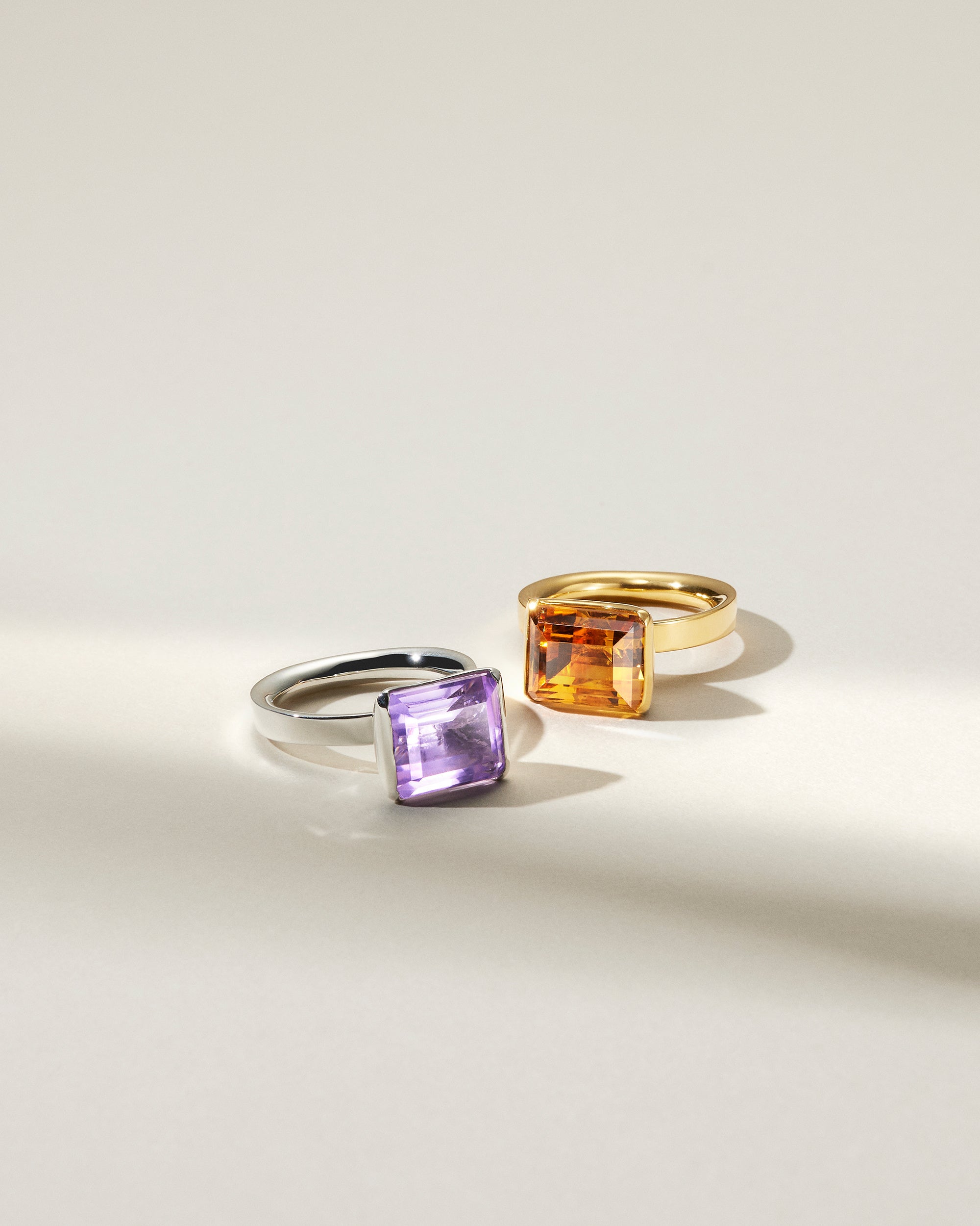 新コレクションのジェムストーンには、大粒で色彩やかな "シトリン"と"アメシスト” を採用。 ジェムストーンのアップサイクルはあまり馴染みがないかもしれませんが、70-80年代日本で大量生産されていたジュエリーで売れ残ったものや、地金を外して宝石の状態で長らく放置されていたものを、SARARTHがモダンなデザインのジュエリーに生まれ変わらせました。