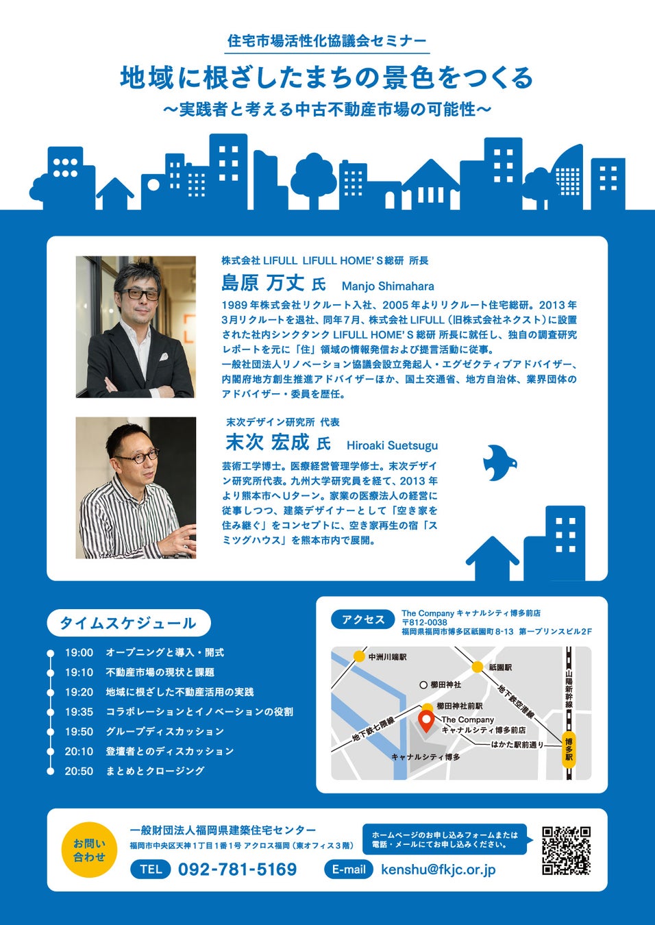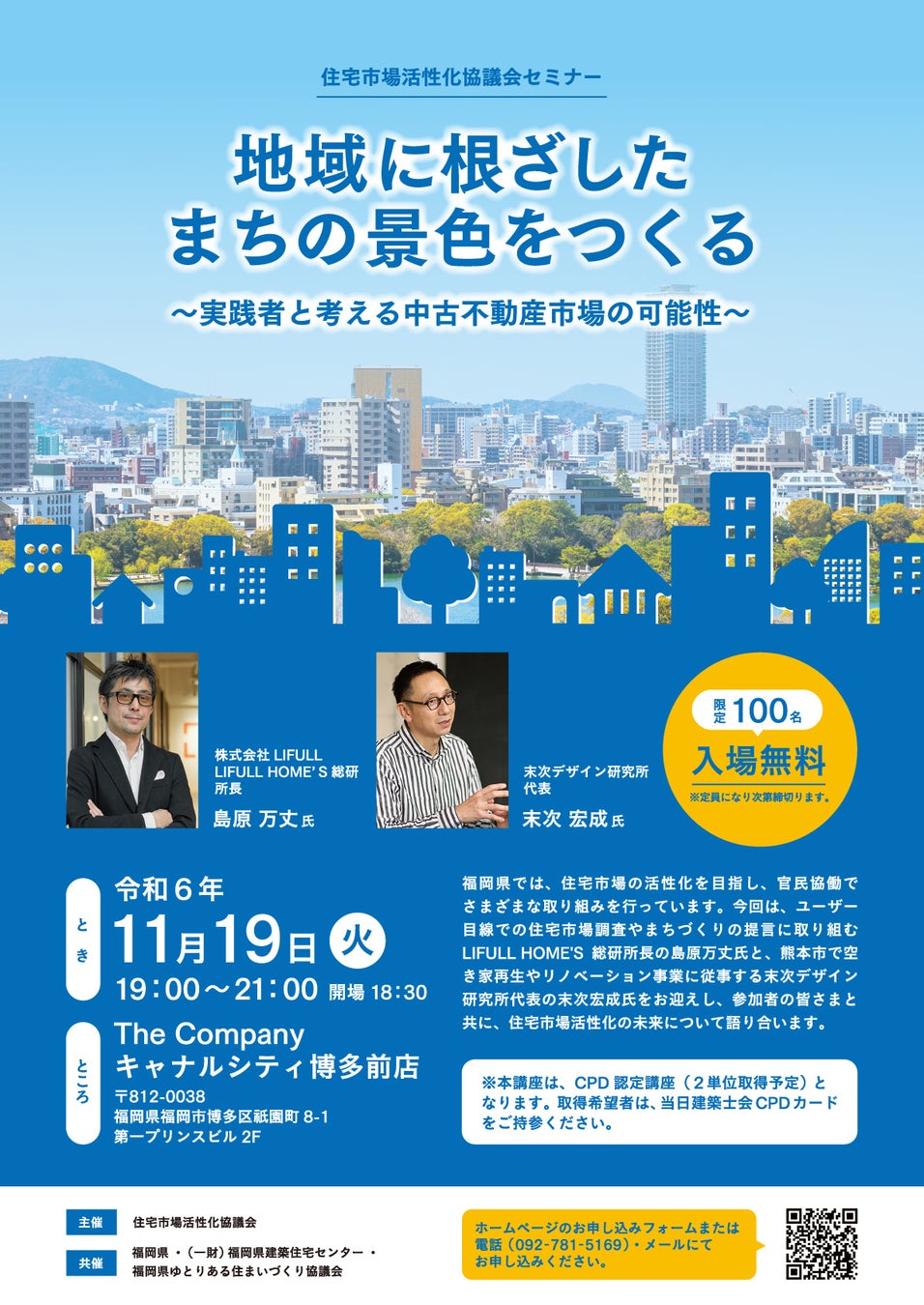 その一環として、11月19日(火)The Companyキャナルシティ博多前店にて「地域に根ざしたまちの景色をつくる~実践者と考える中古不動産市場の可能性〜」と題してセミナーを開催します。