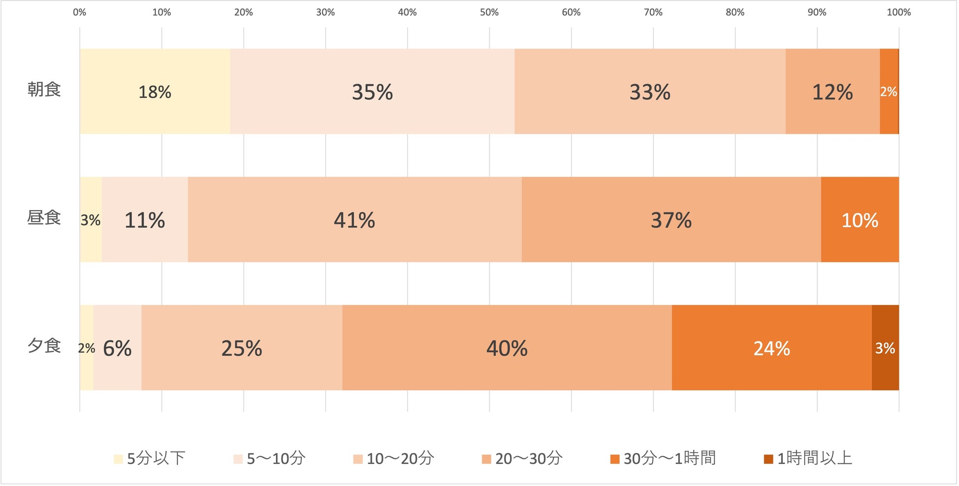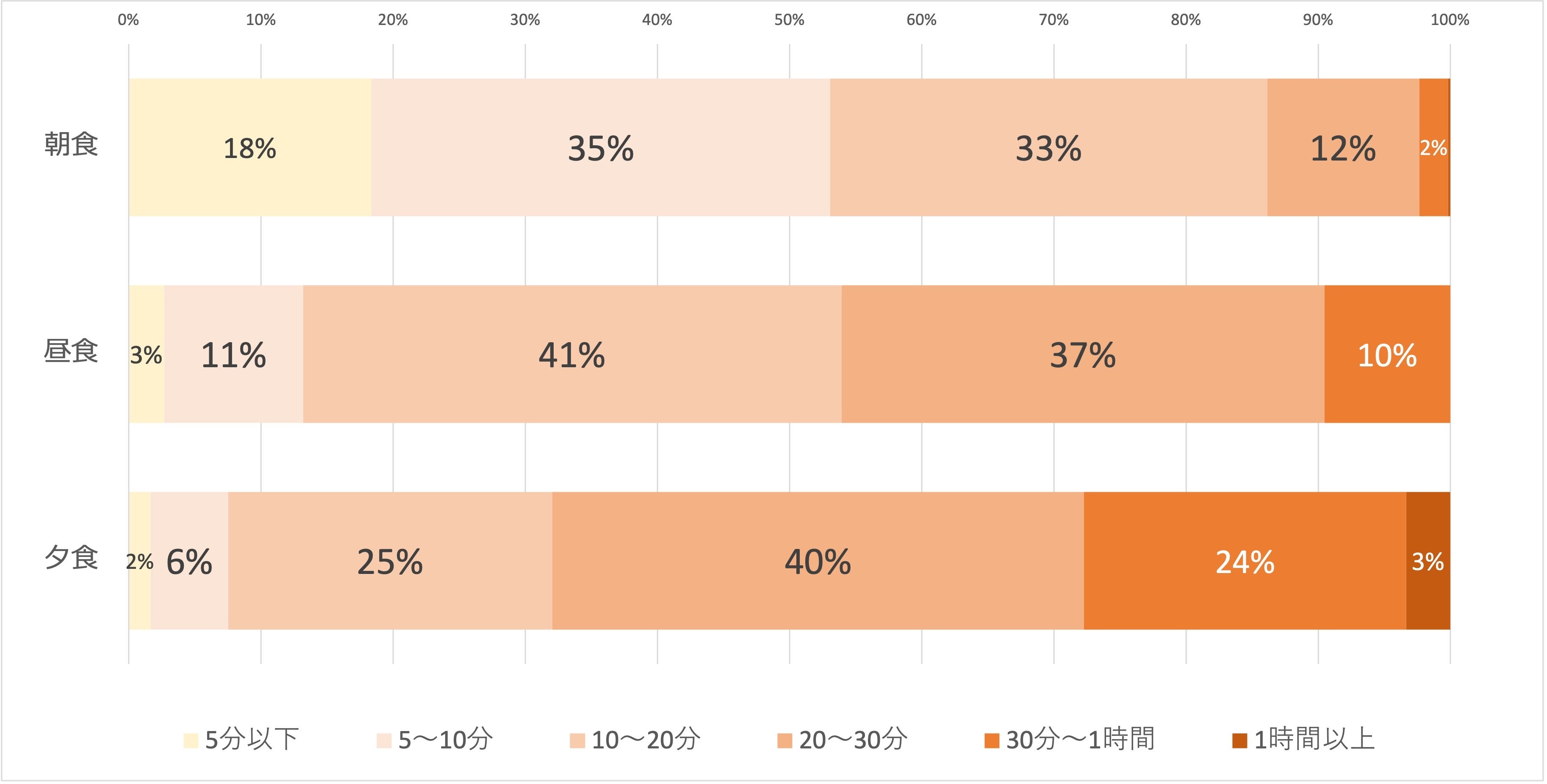 朝食は量が少ないこともあり納得できるが、昼食や夕食ですら「5分以下」や「5分〜10分」で済ませてしまう学生も一定割合いる。早食いも食生活の近代的な問題の1つである。