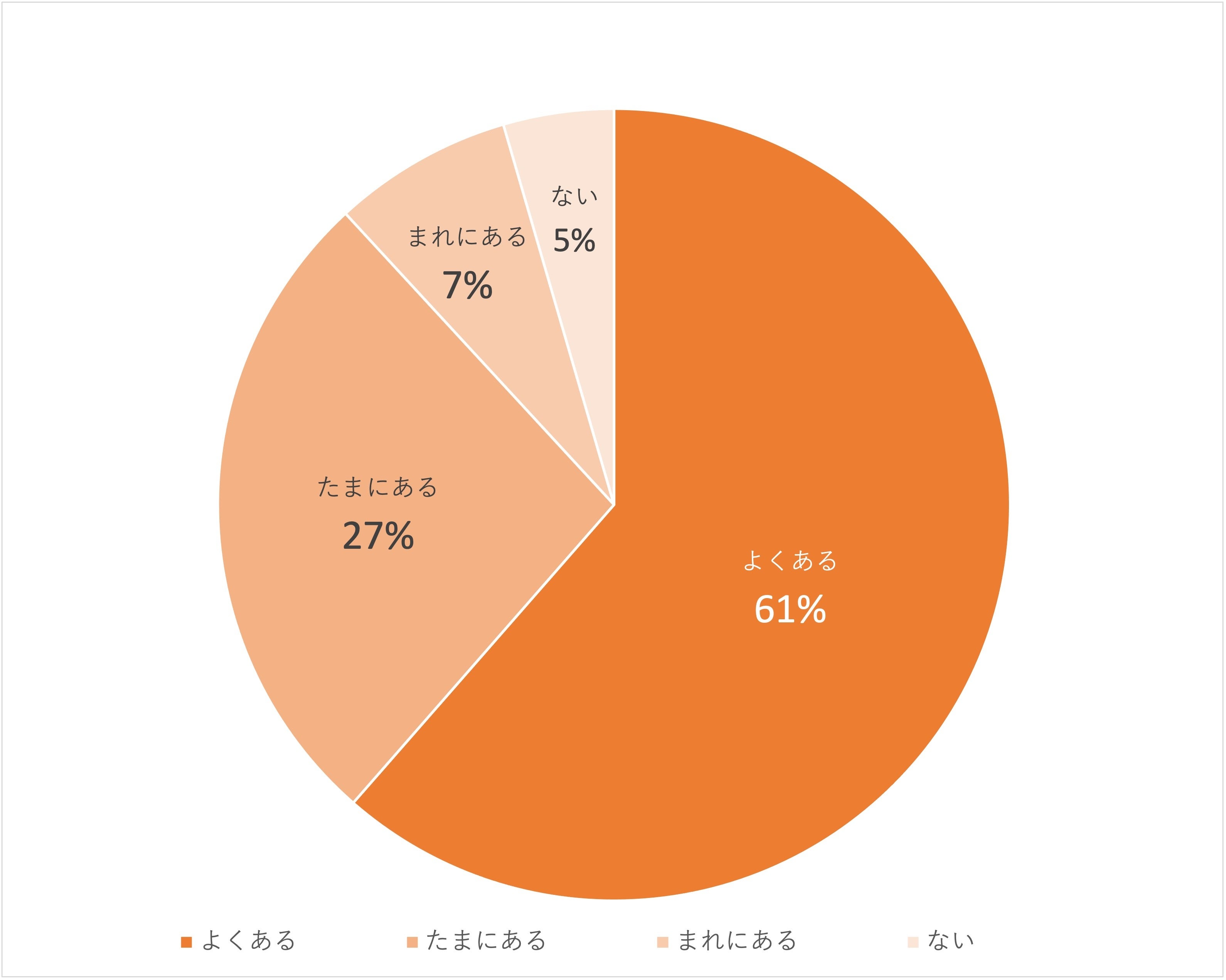 栄養や食事の回数、摂取時間などだけでなく、どのように食事を取るのかも食育・食生活の1つである。そこで、「ながら食べをすることはありますか?」(n=599)と質問したところ、「よくある」と回答した方が61%となった。さらに「たまにある」が27%、「まれにある」が7%、「ない」が5%という結果になっている。