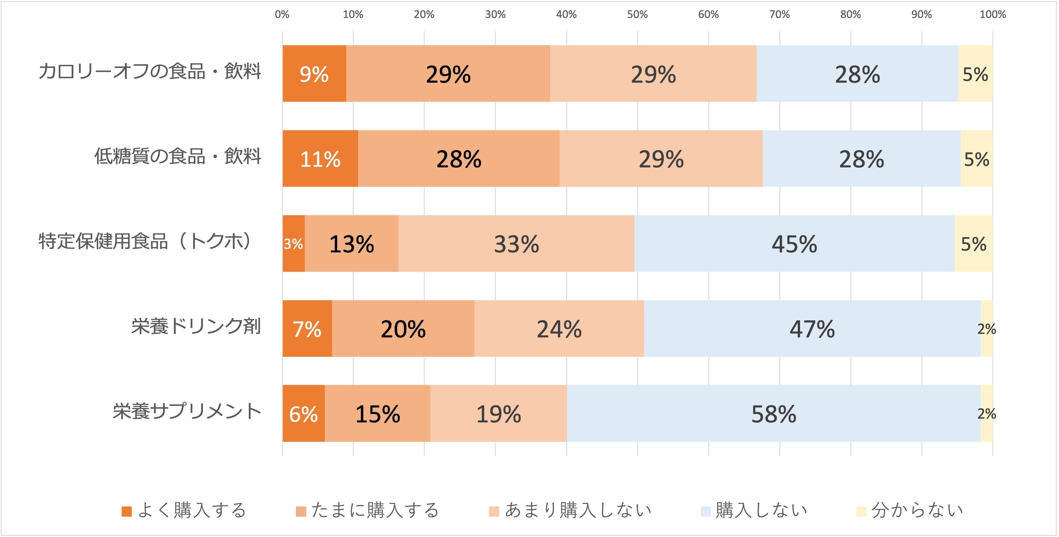 結果は「カロリーオフ食品」や「低糖質の食品」への関心は高いが、「特定保健用食品」や「栄養ドリンク」「栄養サプリメント」などの関心はそこまで高くないことがわかった。