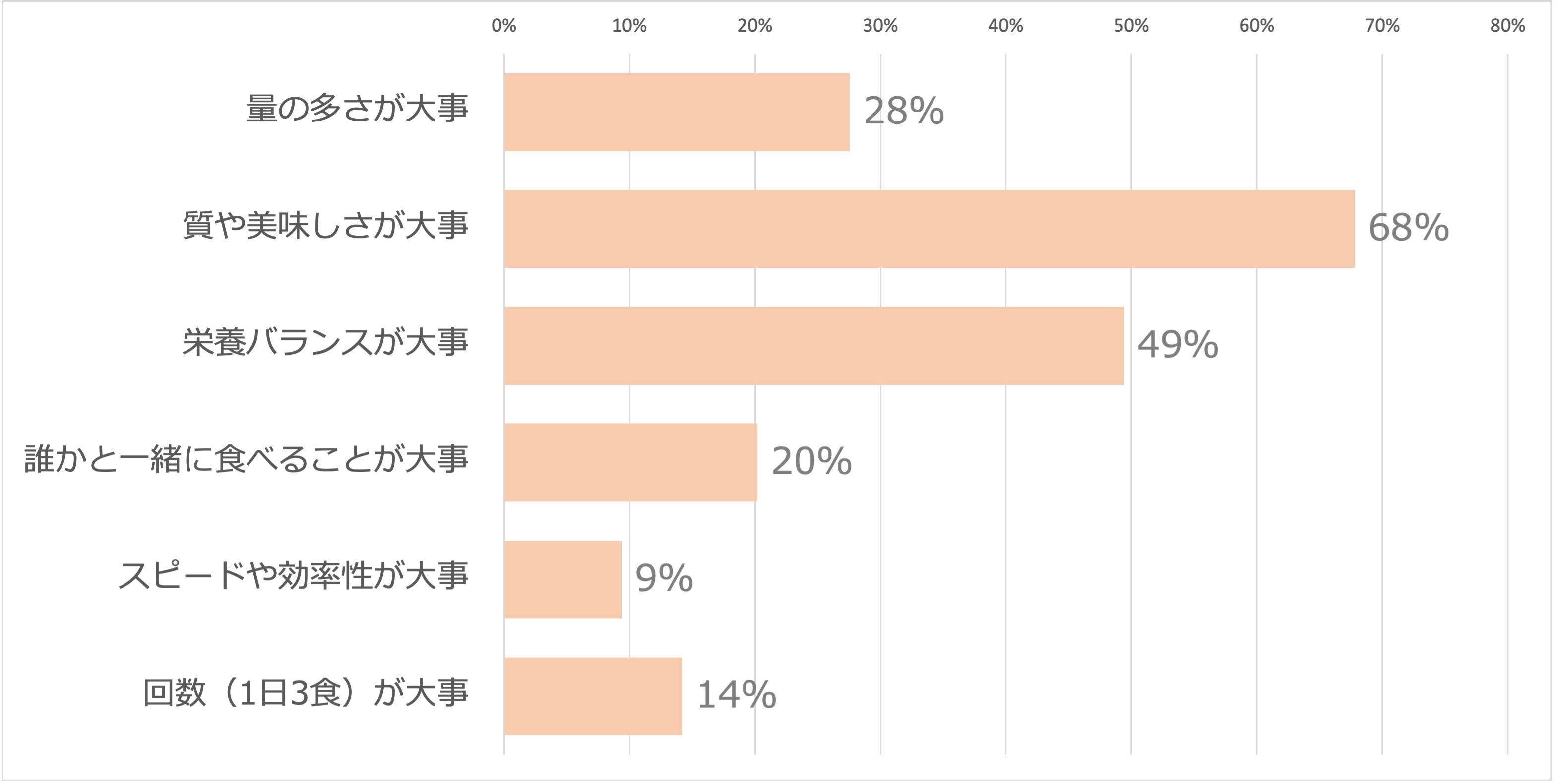 大学生の食生活に対する考えを調査するため、「食事について当てはまる考えを選んでください。」(n=599)と質問したところ、多くの学生が「質や美味しさが大事(68%)」と回答している。