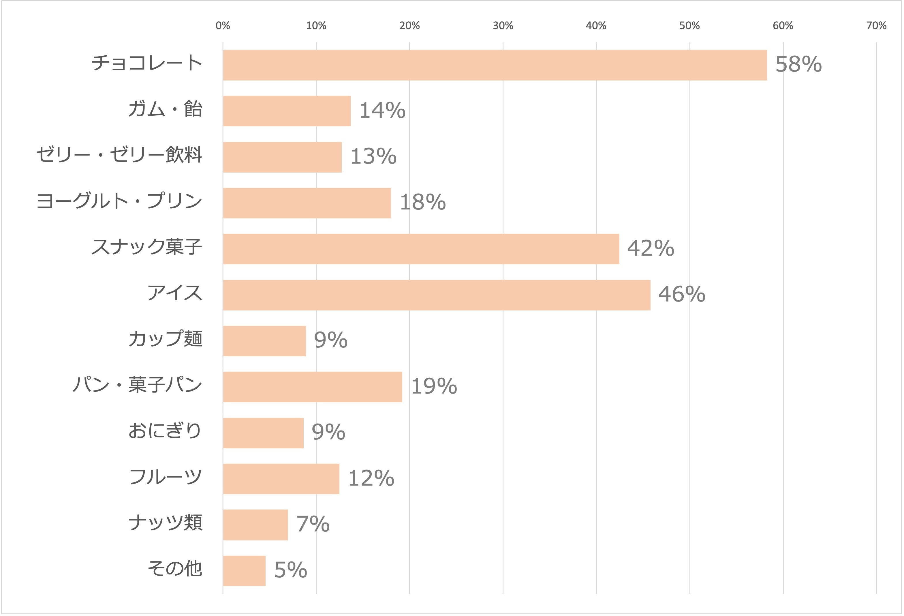 間食や夜食を食べると回答した学生に対して、「間食や夜食でよく食べるものは?」(n=417)と質問した。結果はチョコレート(58%)という回答が1番多く、アイス(46%)やスナック菓子(42%)にも多くの回答が集まった。