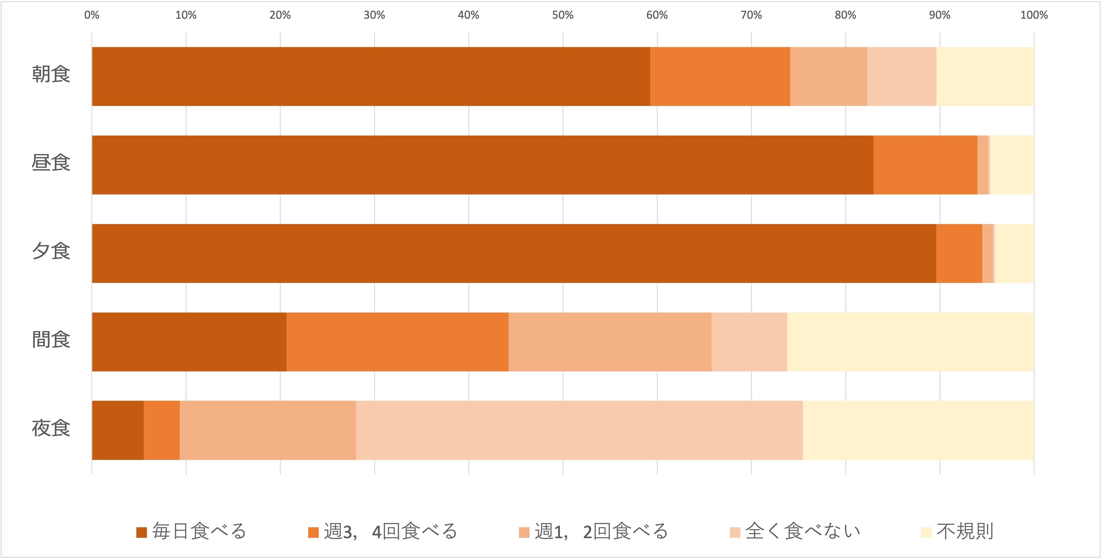 以下で掲載するデータは、食事が提供される環境にいる学生が62%、いない学生が38%であることを前提にご覧いただきたい。