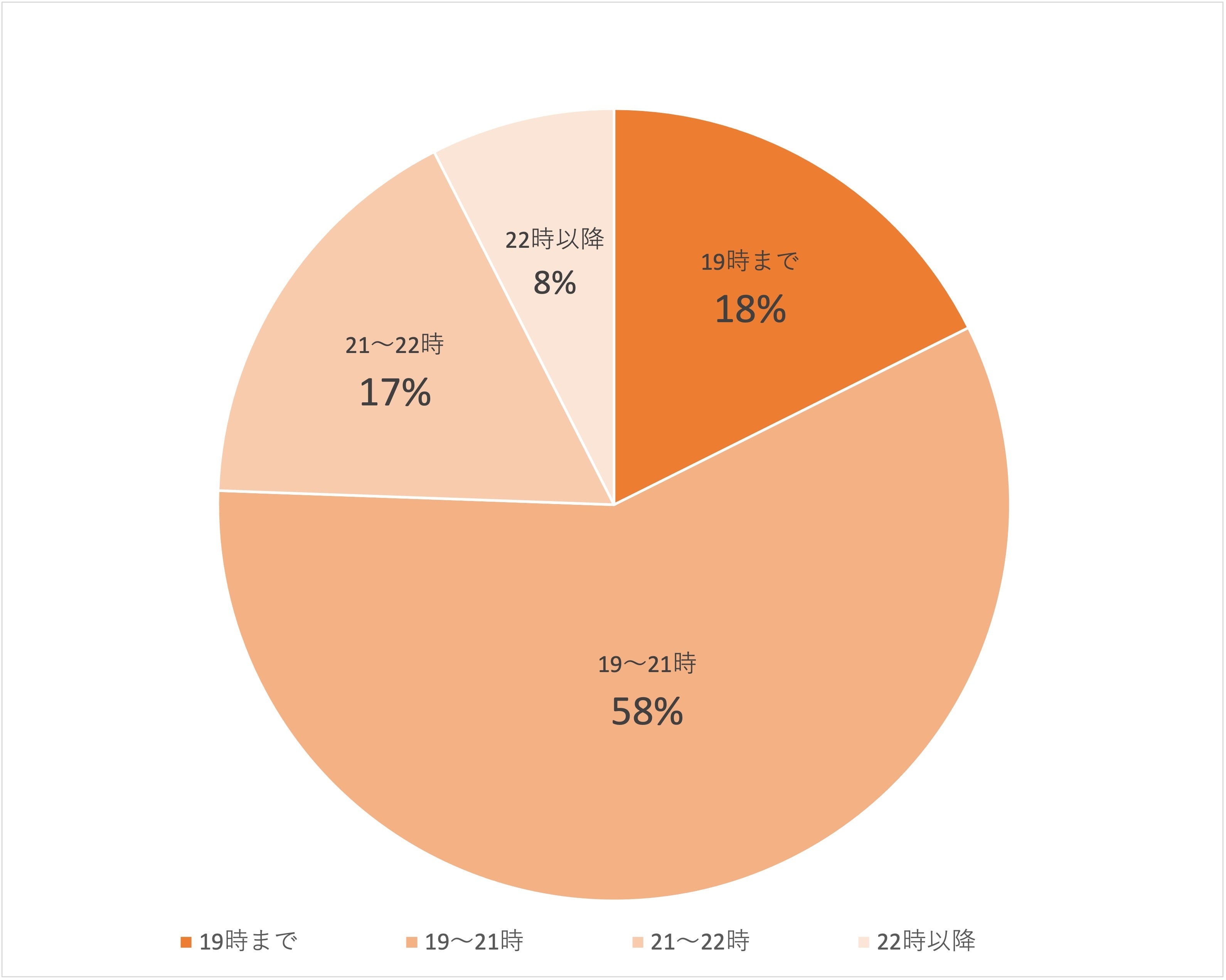また、夕食を食べると回答した方に「夕食は大体何時ごろに食べますか?」(n=573)と質問したところ、19時〜21時(58%)という回答が最も多くなった。健全な時間帯で食事を取る方が多く見られる一方、遅い時間(21時以降)に夕食を摂取する学生も25%いる。