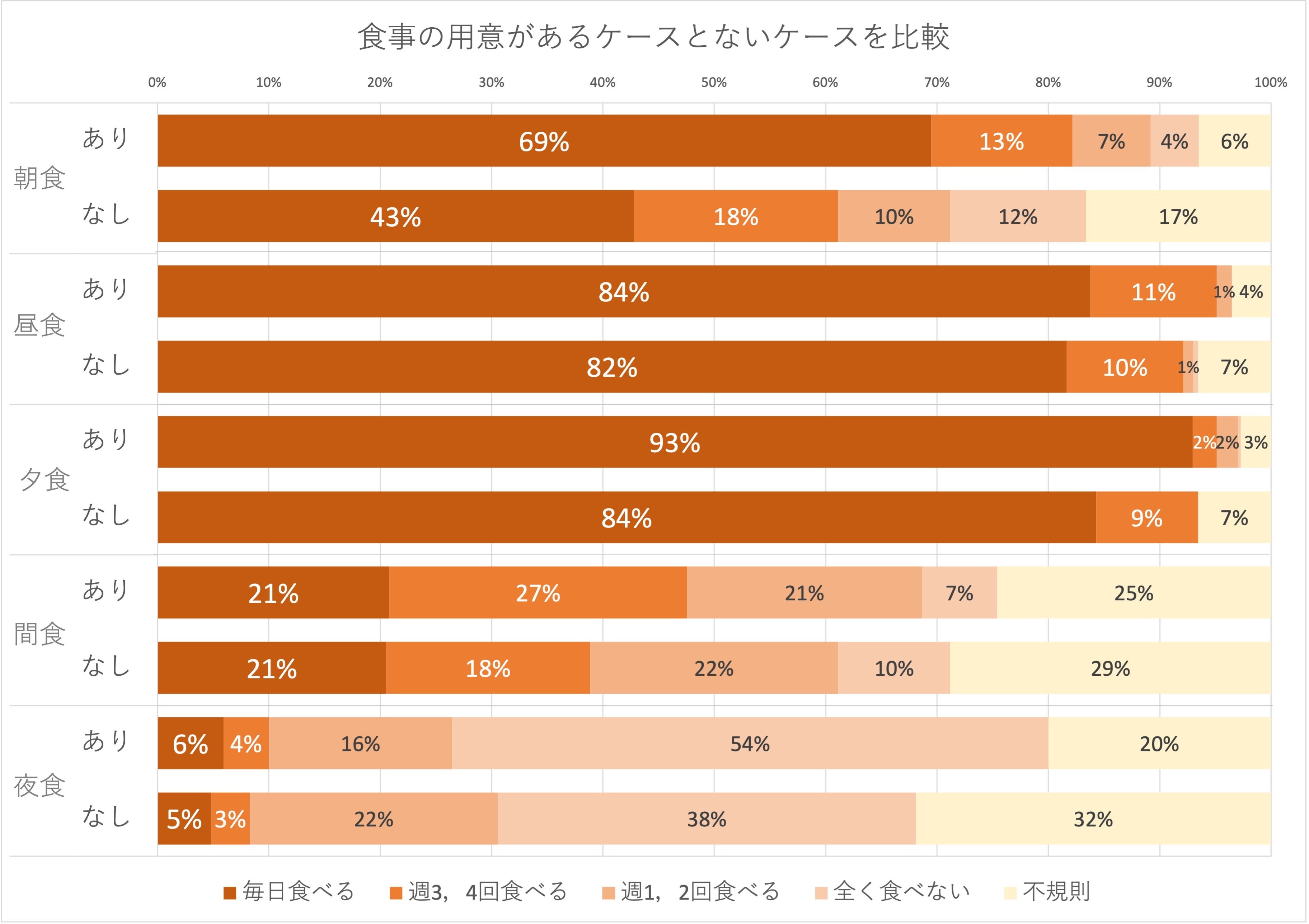 家族と同居している学生と食事付きの学生寮や下宿先に住む学生を「食事の用意がある」、食事なしの学生寮や下宿先に住む学生と一人暮らしの学生を「食事の用意がない」としたとき、朝食を食べる割合はより顕著に別れ、用意がある方が69%、用意がない方が43%という結果になった。