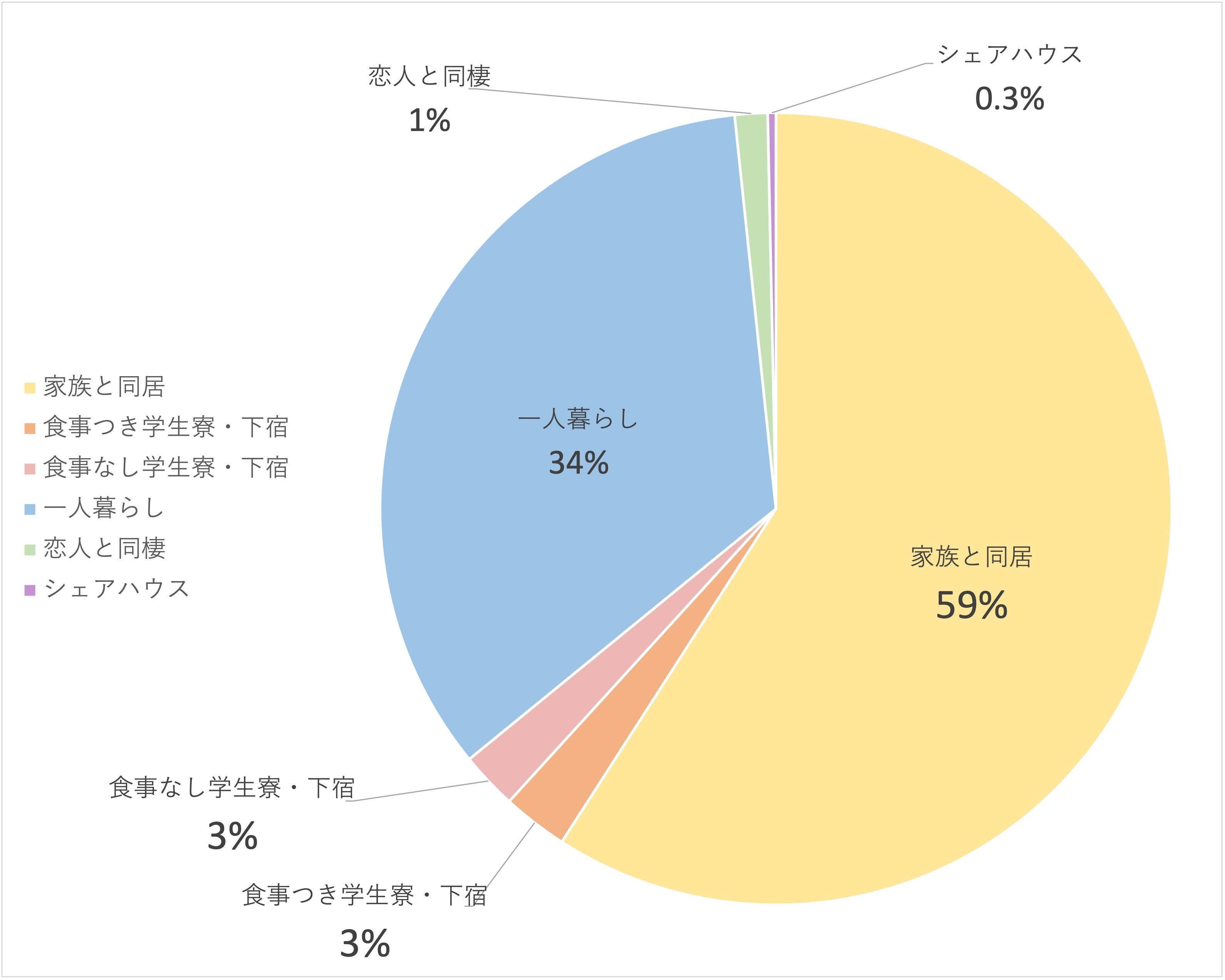 今回の実態調査の対象となった599人のうち、家族と同居している学生が59%、食事付きの学生寮や下宿先に住む学生が3%、食事なしの学生寮や下宿先に住む学生が3%、一人暮らしの学生が34%である。