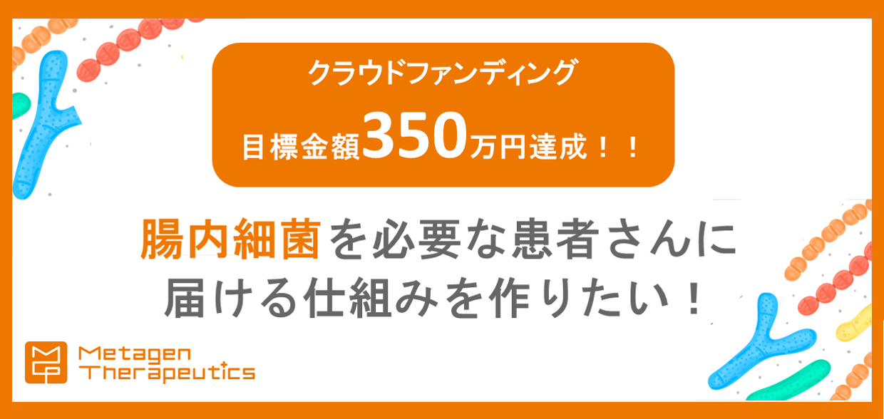 腸内細菌研究に基づいた医療・創薬を推進するメタジェンセラピューティクス株式会社(本社:山形県鶴岡市、代表取締役社長CEO:中原拓)は、「腸内細菌叢(そう)バンク」の構築支援を募るクラウドファンディングを完了し、目標金額である350万円を達成いたしました。計151名の方からご支援をいただき、支援金額は目標金額を大きく上回る429万5千円に達しました。
