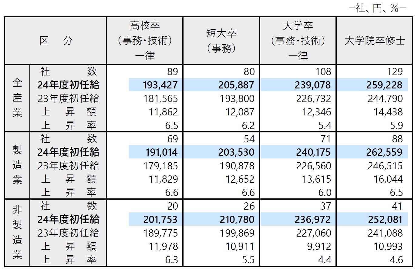 2024年度の賃金見直しによって確定された2024年4月入社者の決定初任給(学歴別)。なお、初任給は原則として時間外手当と通勤手当を除く、諸手当込みの所定内賃金である。