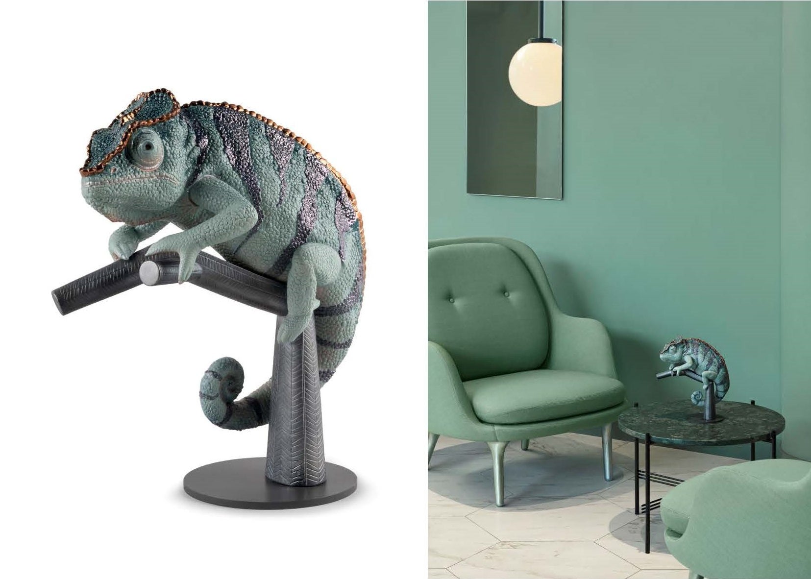 大胆な色使い、本物と見紛うほどの細やかな造形美。リヤドロの新しい彩色技術がふんだんに施された、色鮮やかなカメレオン。