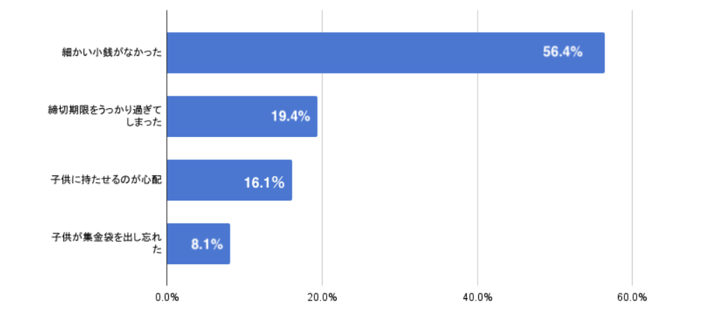 今回、「現金集金」で困った経験がある保護者様にその理由を聞いてみたところ、半数以上の方々が「細かい小銭がなかったから」と回答していることがわかりました。