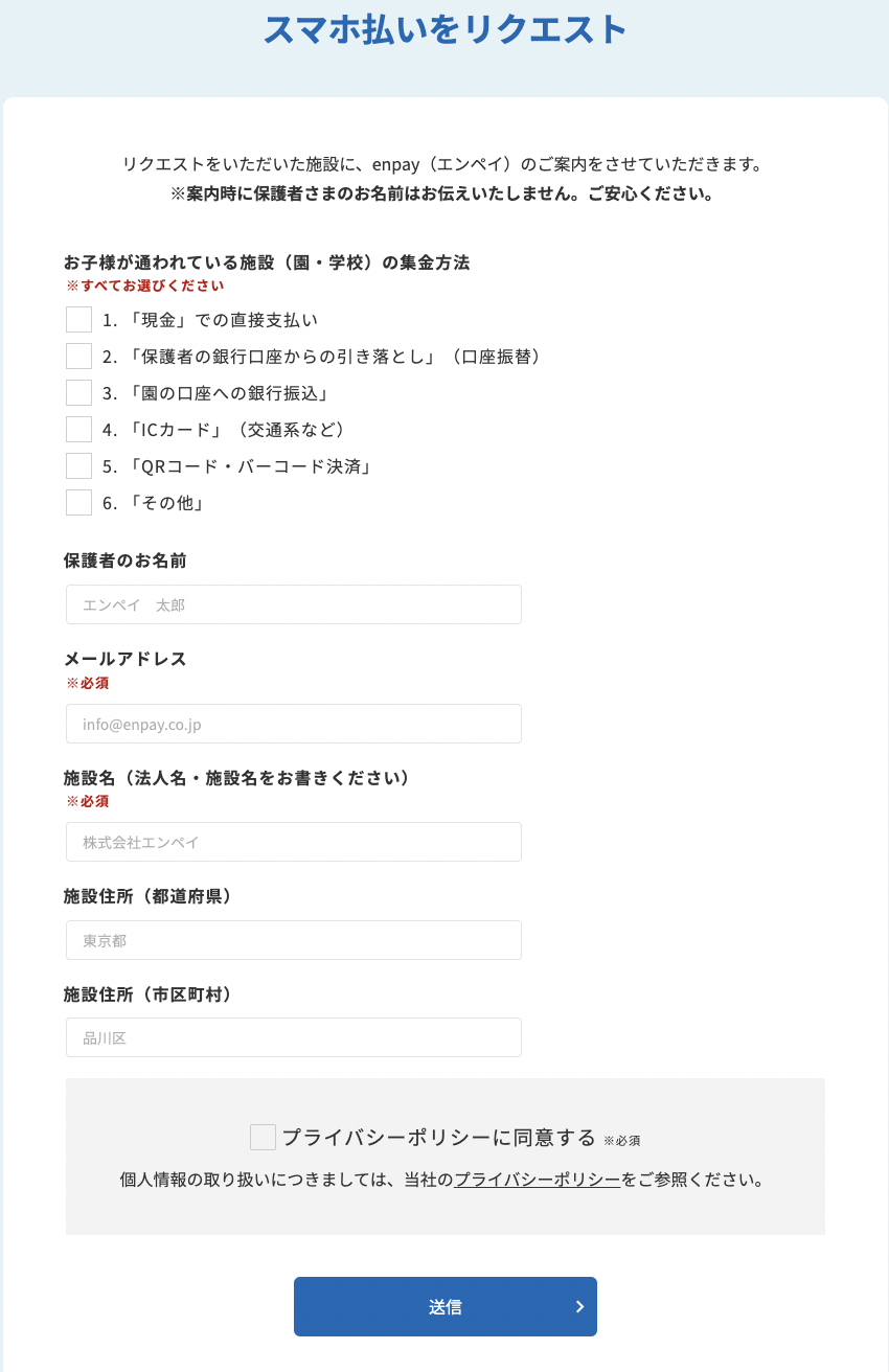 「保護者向けキャッシュレス化リクエストページ」は、保育園や子ども園などの教育施設を利用する保護者が、キャッシュレスサービスのリクエストをエンペイに申請できるページです。