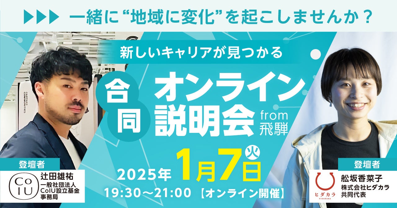 株式会社ヒダカラ(本社:岐阜県飛騨市)は、2026年に開校予定のCo-Innovation University(仮称)(略称:COIU(仮称))(所在地:岐阜県飛騨市)と合同で、2025年1月7日(火)にオンライン会社説明会&クロストークイベントを開催します。人口減少先進地である飛騨市で、新しい取り組みや新しいアイディアで地域におもしろい変化を起こそうとしている2団体が集結し、飛騨ではたらく面白さや、飛騨でどんな変化が起こるかなど、リアルに語ります。地域内の団体同士で人材を奪い合うのではなく共に呼びかける、新しい取り組みです。「飛騨ではたらく」に興味を持っていただくきっかけづくりとして初開催いたします。