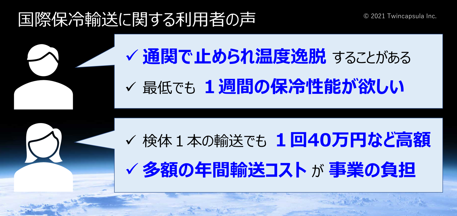 ツインカプセラがこれまでに実施したエンドユーザへのヒアリングでは、国際保冷輸送では、通関に数日を要することも多く、最低でも1週間以上の保冷性能が欲しいといった声や、検体1本の輸送でも数十万円の輸送費がかかり事業の負担になっているといった声を確認しており、保冷輸送サービス利用者が期待する「確実」しかも「低料金」なサービスは存在しないというのが常識であり、課題ともなっています。