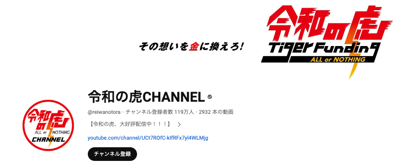 「令和の虎チャンネル」は、『Tiger Funding』(タイガーファンディング)という企画にて、一般人起業家である志願者(虎の子)が事業計画をプレゼンテーションし、投資家たる審査員(虎)が出資の可否を決定するという番組です。YouTubeの登録者数は119万人(2024年現在)。