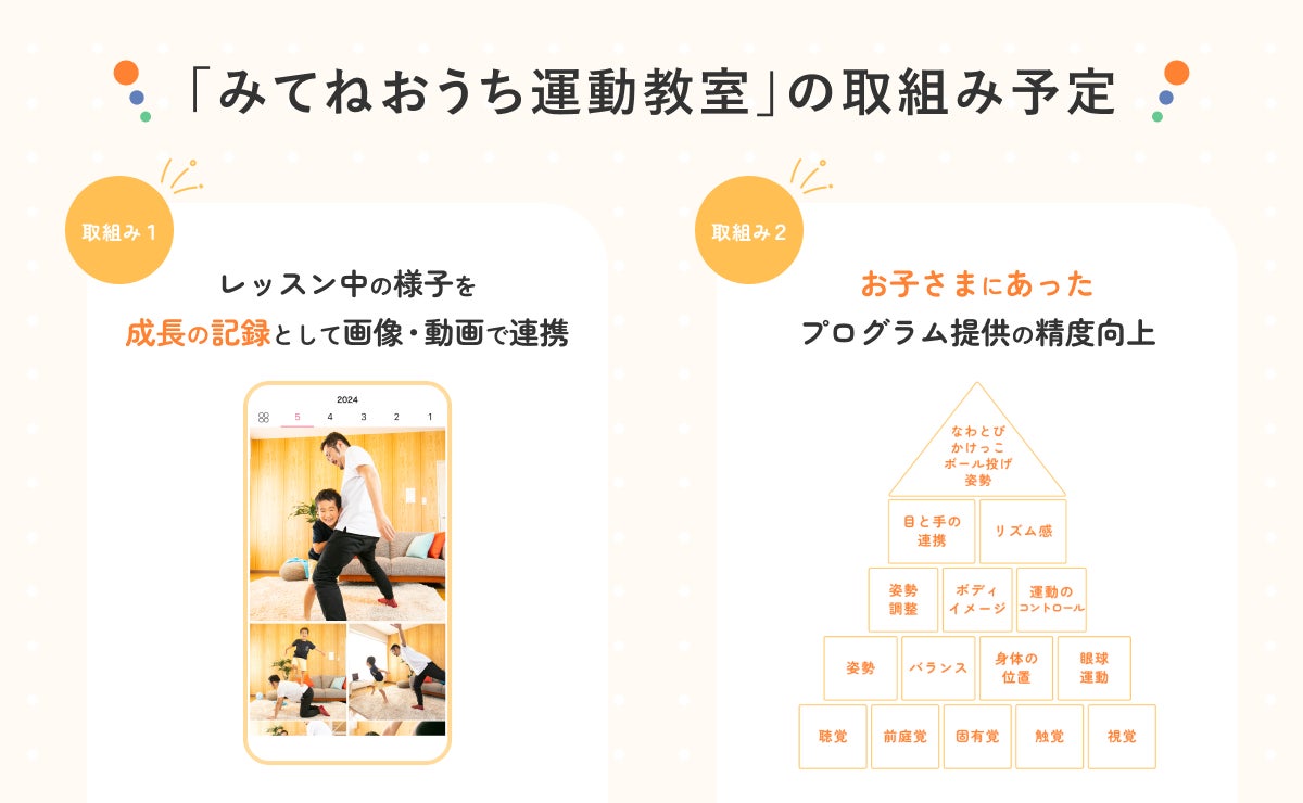 MIXIが提供する子どもの写真・動画共有アプリ「家族アルバム みてね(以下、みてね)」の新たなサービス展開として、オンラインの運動レッスンサービス「みてねおうち運動教室」を試験的に運営しておりましたが、今回の資本業務提携の開始を経て、より多くのお子さまやご家族に「できた!」の喜びを届けられることを目指します。