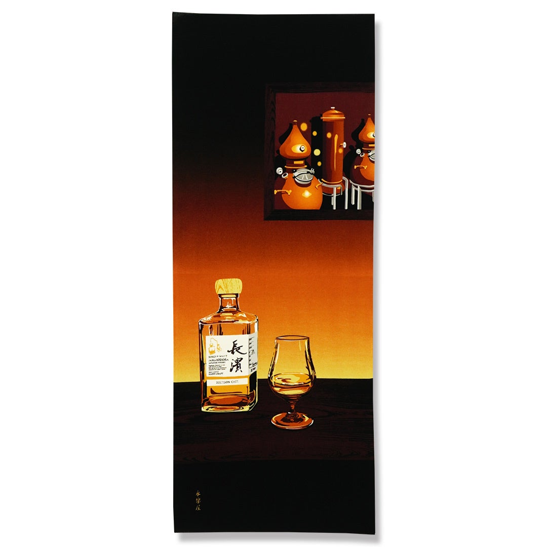 永楽屋は長濱蒸溜所の協力の下、バーカウンターで長濱蒸溜所のシングルモルトウイスキー「長濱」を楽しむ様子を描いたウイスキー手ぬぐいを発表しました。長濱蒸溜所は煉瓦造りの外観や日本最小規模の蒸溜所であるという点に加えて、世界的に珍しいホーガ社製のアランビック型ポットスチルを保有しています。