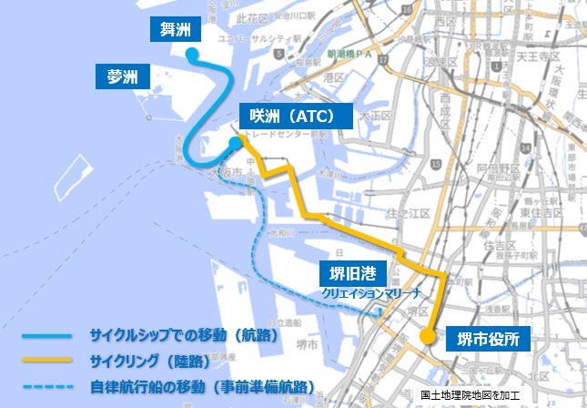 また、本実証実験は、堺市によるサイクリングと舟運を掛け合わせた「サイクルシップ実証実験」の一環としても実施しており、堺市内から走行してきた自転車を自律航行船に乗せて舞洲まで渡ることで、咲洲を起点とした「サイクルシップ」の可能性を検証し、広域的な自転車周遊や新たなサイクルツーリズム創出につなげることを目的としております。