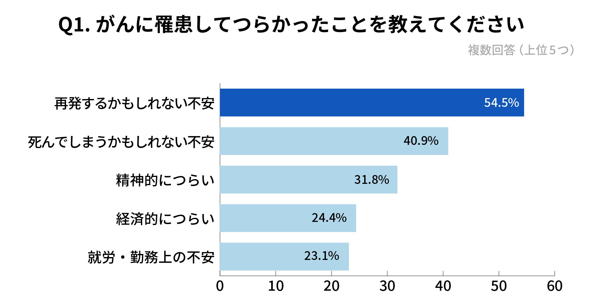 - がんに罹患して最もつらかったことは「再発するかもしれない不安」(54.5%)が最多