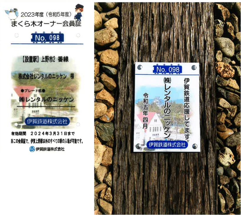 設置するプレートは合成樹脂製で縦20cm×横15cm、氏名や企業名とともに好きなメッセージを各10文字以内で印字ができます。伊賀上野駅以外の伊賀線(忍者線)14駅構内の枕木に取り付けができ、4月から1年間設置されます。オーナーには、プレートが設置された枕木の写真と会員証が贈られ、設置期間終了後にはプレートが返送されます。当社は、上野市駅2番線(写真左:№98)と、四十九駅(写真右:№99)の2駅の「まくらぎオーナー」となり、伊賀鉄道と地域社会の発展を応援してまいります。