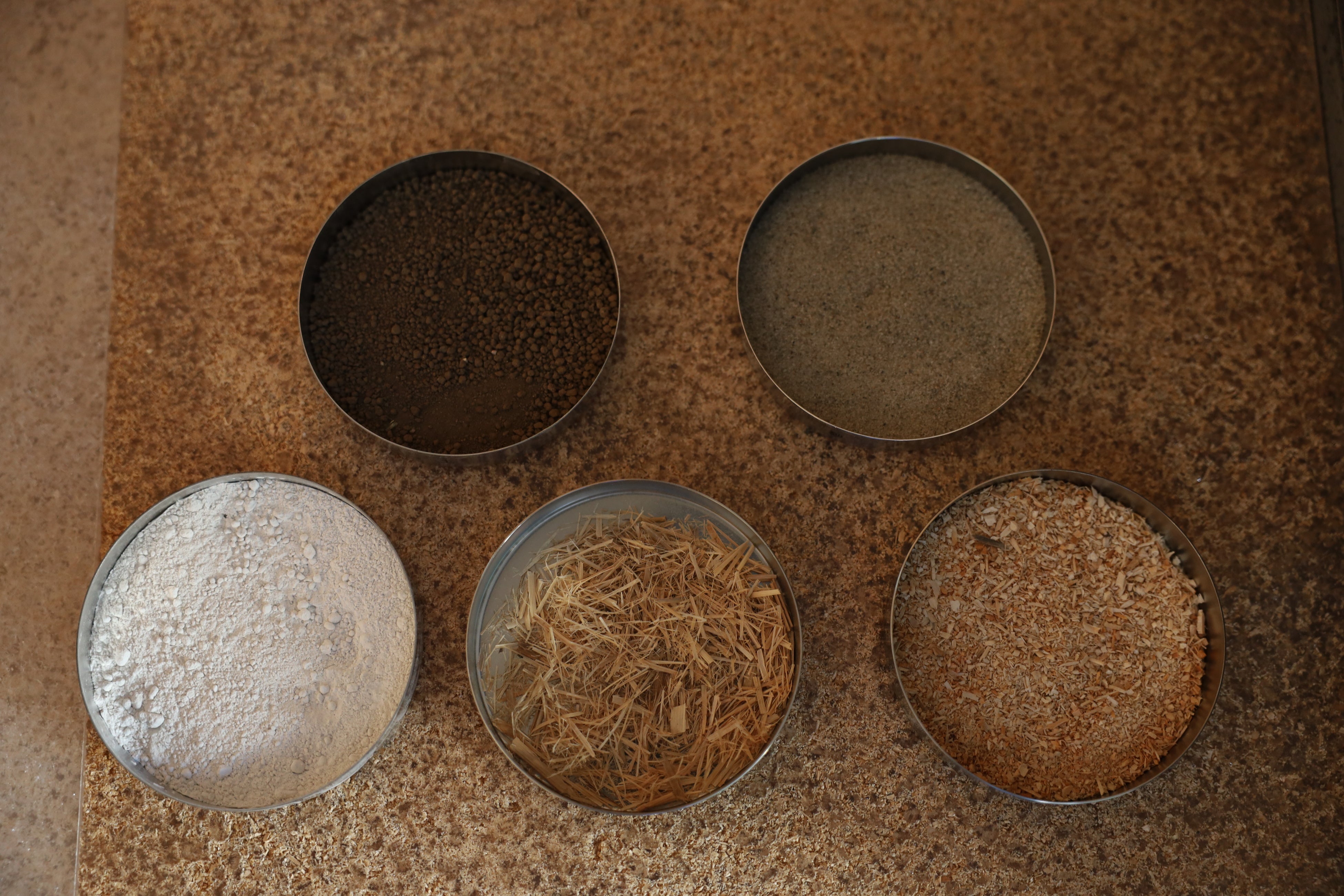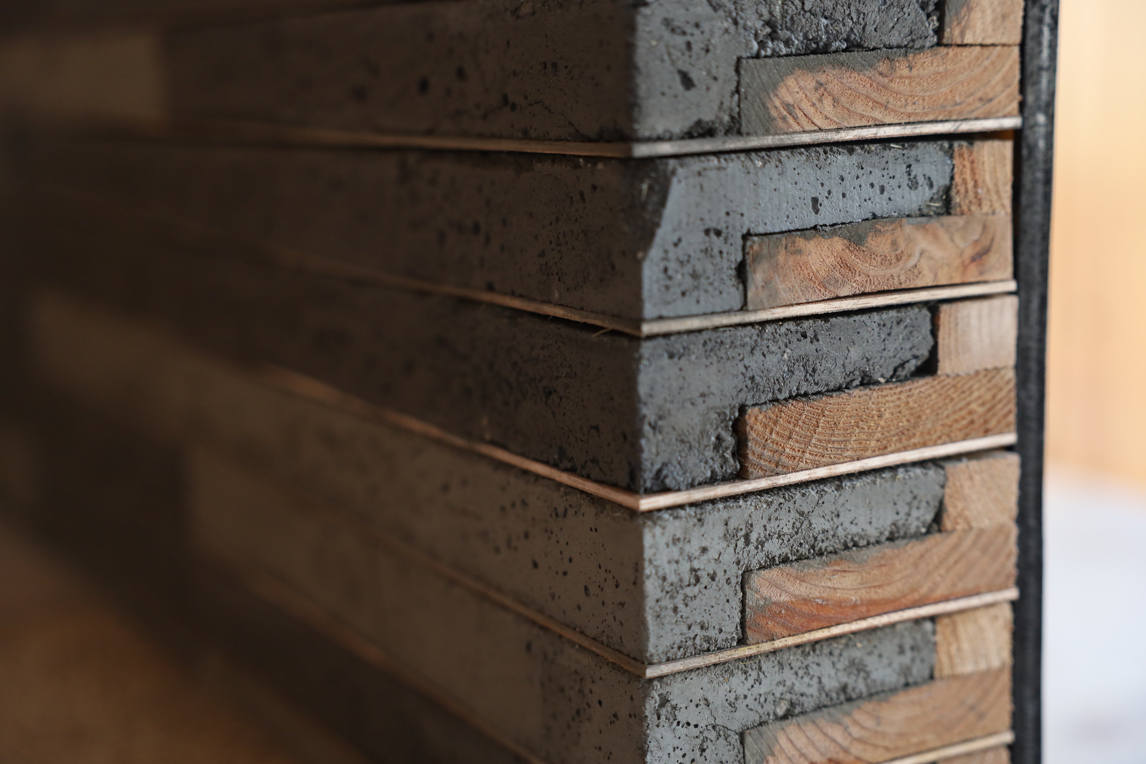 「立体木摺土壁」は建設発生土や藁スサ、おがくずといった自然由来の素材を用いながら、土と木を積層した壁です。古来より世界中で用いられてきた、日干し煉瓦を応用して、内装材として淺沼組で独自開発しました。土壁を自立可能な構造として安定化・軽量化し、短時間での施工を可能にしました。自然素材のみの使用により、低炭素性(建設時CO2排出量抑制)、炭素貯留性(土と木に炭素を貯留)、資源循環性(土と木の分離による再生利用)、吸放湿性(空気環境改善)に優れています。