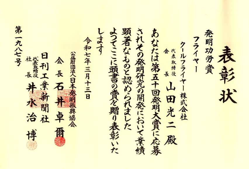 クールフライヤー、第50回発明大賞 発明功労賞を受賞