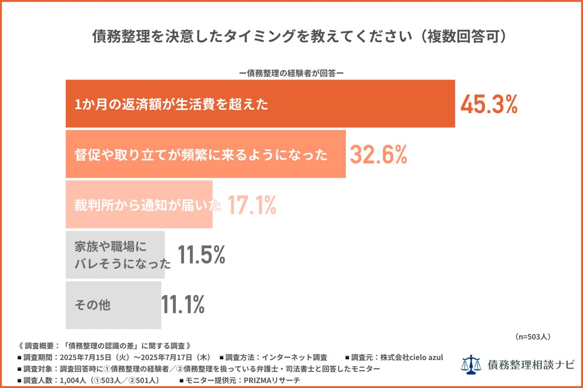 はじめに、債務整理の経験者に「債務整理を決意したタイミング」について尋ねたところ、『1か月の返済額が生活費を超えた(45.3%)』が最多で、『督促や取り立てが頻繁に来るようになった(32.6%)』『裁判所から通知が届いた(17.1%)』と続きました。