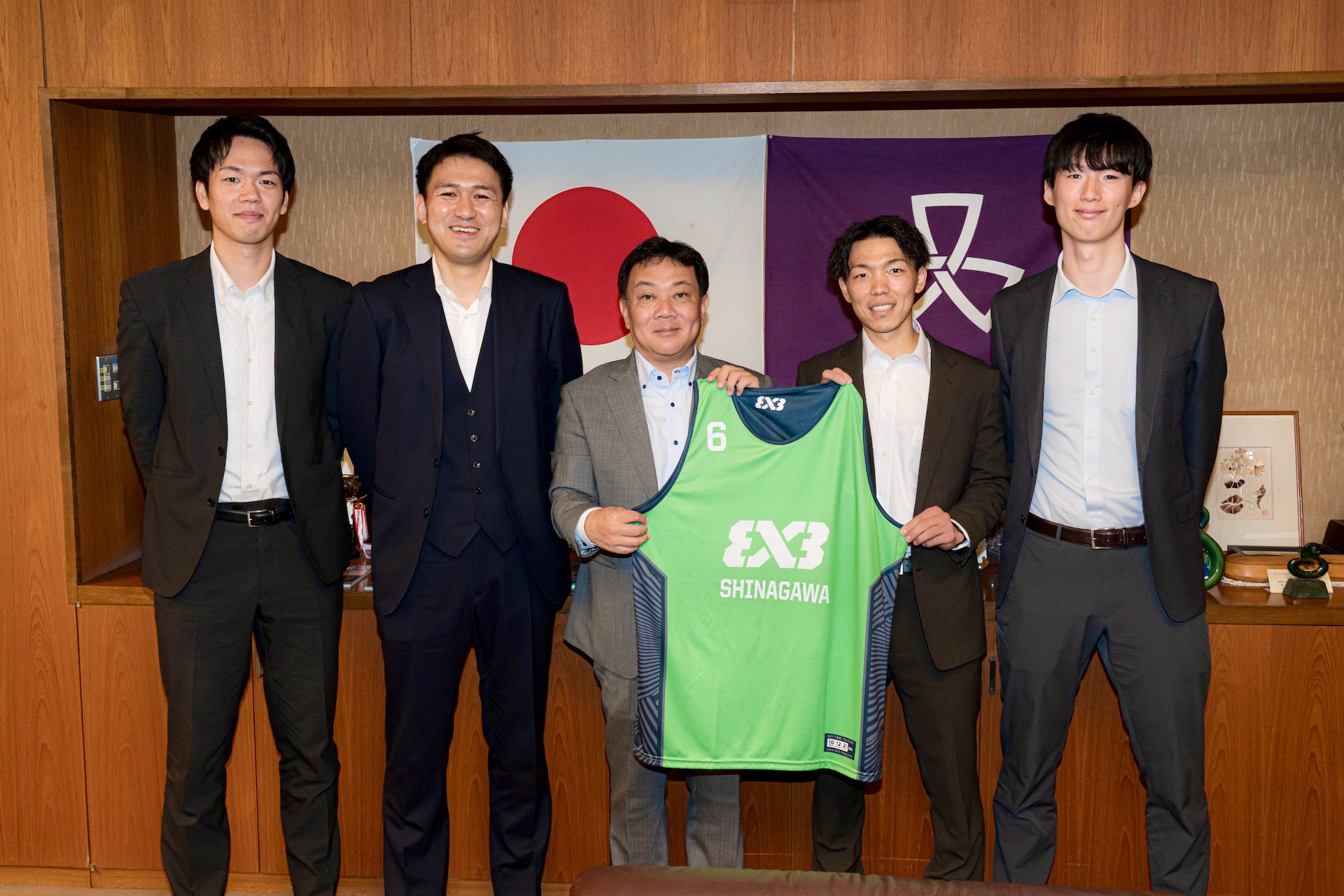 最後に、「SHINAGAWA JPN」と印字された 3x3 World Tour Masters 出場チームのみに配布されるユニフォームを区議会議長に贈呈し、記念撮影を行いました。