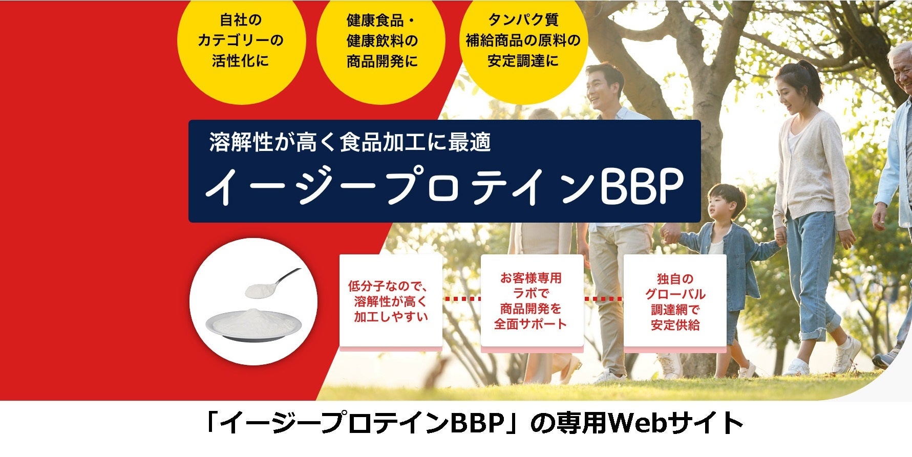 弊社は、中期経営計画においてフードソリューション分野の注力市場である「新しい食ニーズ」に 対応した製品の研究開発に取り組んできました。この度、コラーゲンを弊社独自の技術を用いて加水分解し低分子化した「イージープロテインBBP」を、需要が拡大しているタンパク質補給食品に最適なタンパク質原料として発売しました。“イージー”とは、乳清タンパク質(ホエイプロテイン)や大豆タンパク質など他のタンパク質原料と比較して溶解性に優れ、既存の商品に本商品を加えても風味を損なわないため、簡単に使えることを意味しており、タンパク質補給食品の開発に最適な製品です。