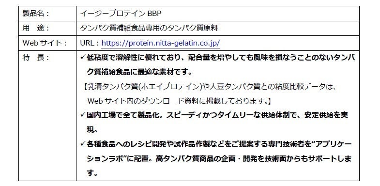 新田ゼラチン株式会社(本社:大阪府八尾市、代表取締役社長:尾形 浩一)は、成長著しいタンパク質補給食品市場の中、食品メーカーの商品開発をサポートすべく、コラーゲン由来のタンパク質素材『イージープロテインBBP』を2022年5月から発売しました。