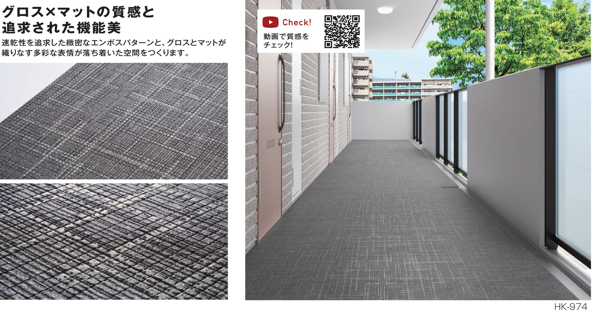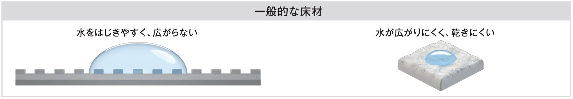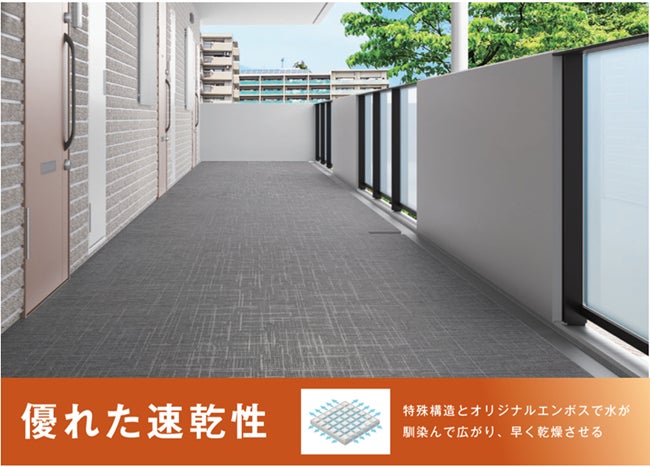 マンションの共用廊下やバルコニー等に使用される一般的な床材は、降雨時に発生する水溜まりが長時間に渡って滞留し通行者の安全性を損ねてしまう恐れがありました。「ハイスイカラットHK」は、特殊なエンボス構造によって、床面に発生した水溜まりがシート表面に馴染むよう薄く広がるのが特徴です。そのため、一般的な床材よりも床面を速く乾燥させる効果が期待できます。