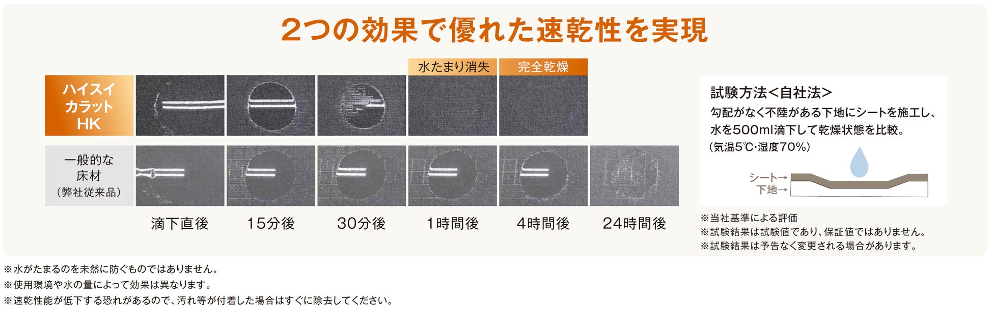 「ハイスイカラットHK」は凹凸がある床面下地へシートを施工した場合でも、床面に発生した水溜まりの乾燥時間を短縮させる効果が期待できます。