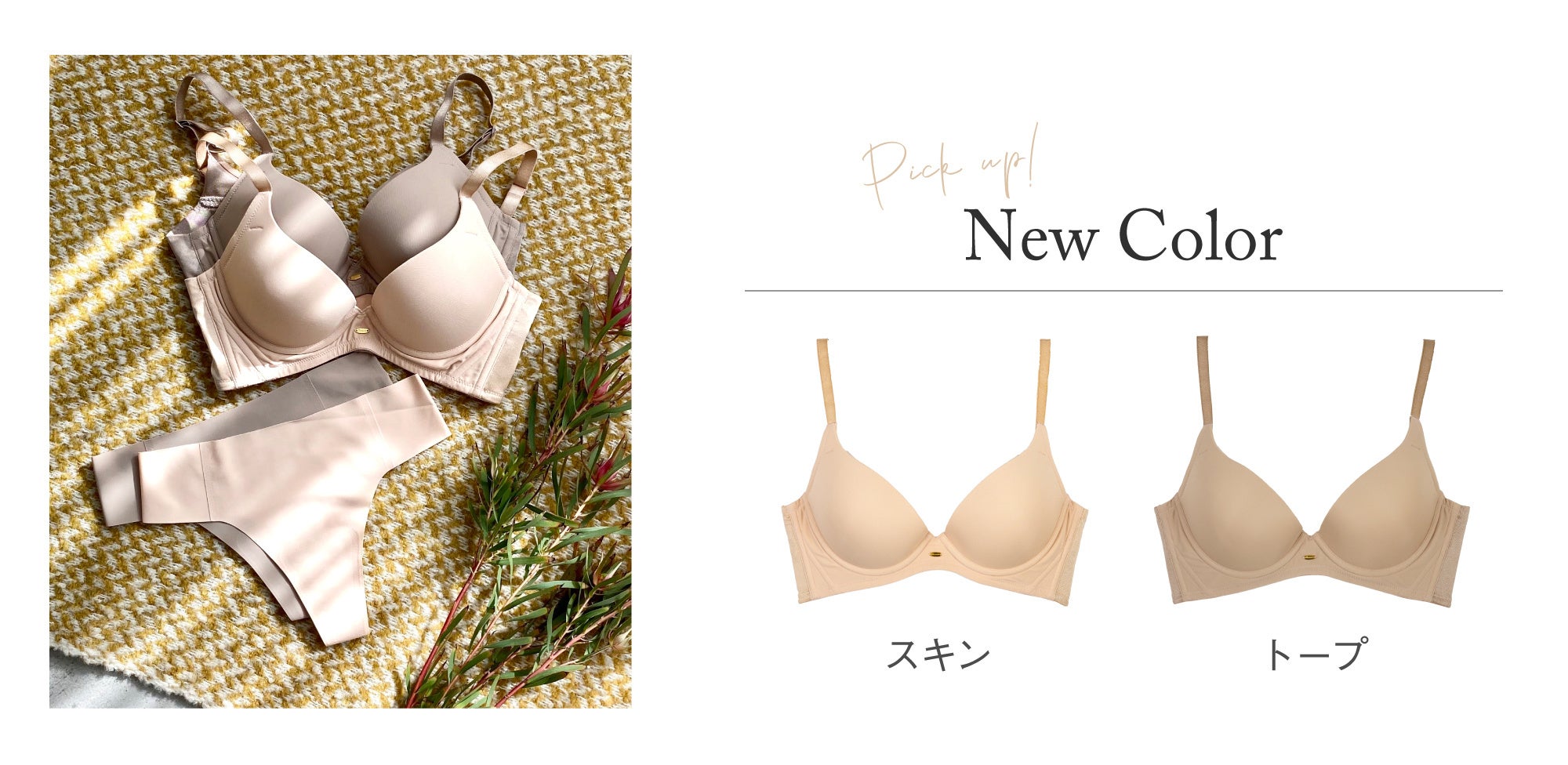 ユーザーからのご要望にお応えし、透けにくいカラー「スキン」「トープ」、2種の新カラーを展開、ヌーディなカラーが増えることで、様々な肌の色に合わせやすくなりました。さらに、完全無縫製仕様のスタンダードョーツとタンガが新しく登場します!アウターにひびきにくいショーツの展開も増え、インナーの透け見えや体のラインが気になる季節でも、ブラとセットで着用いただくことで「ファッションに縛られない“育乳”」が出来るようになりました。