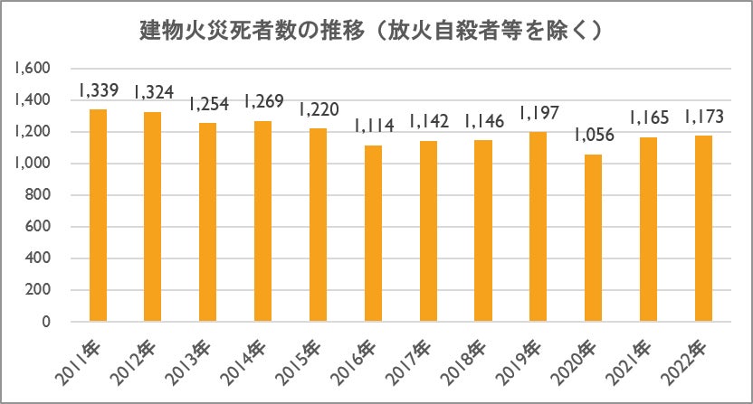 住宅用火災警報器の設置義務化から10年以上が経過しましたが、建物火災の死者数はここ数年また増加傾向にあります(建物火災の死者の9割以上が住宅で発生)。
