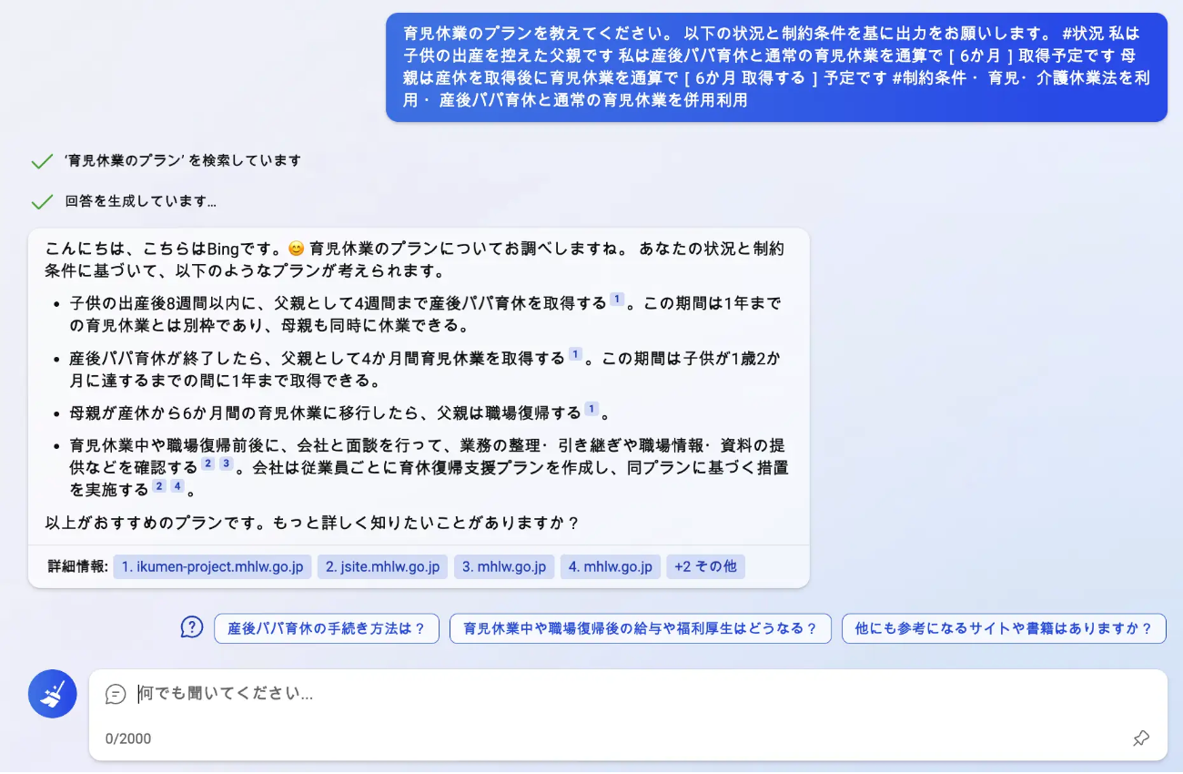 (参考)Bingにて父親6か月・母親6か月取得予定の設定で出力