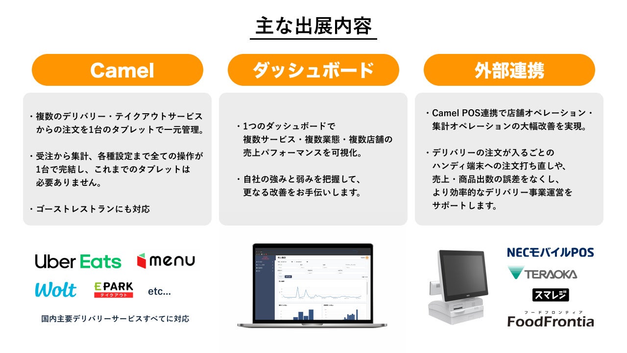 「Camel」の展示ブースでは、イートイン×デリバリーのハイブリット経営から始める飲食店業務のDX化を中心としたコンセプトとした展示を行います。また、幅広い連携サービスのご紹介や、サービス導入済み飲食事業者様の事例などをご紹介します。