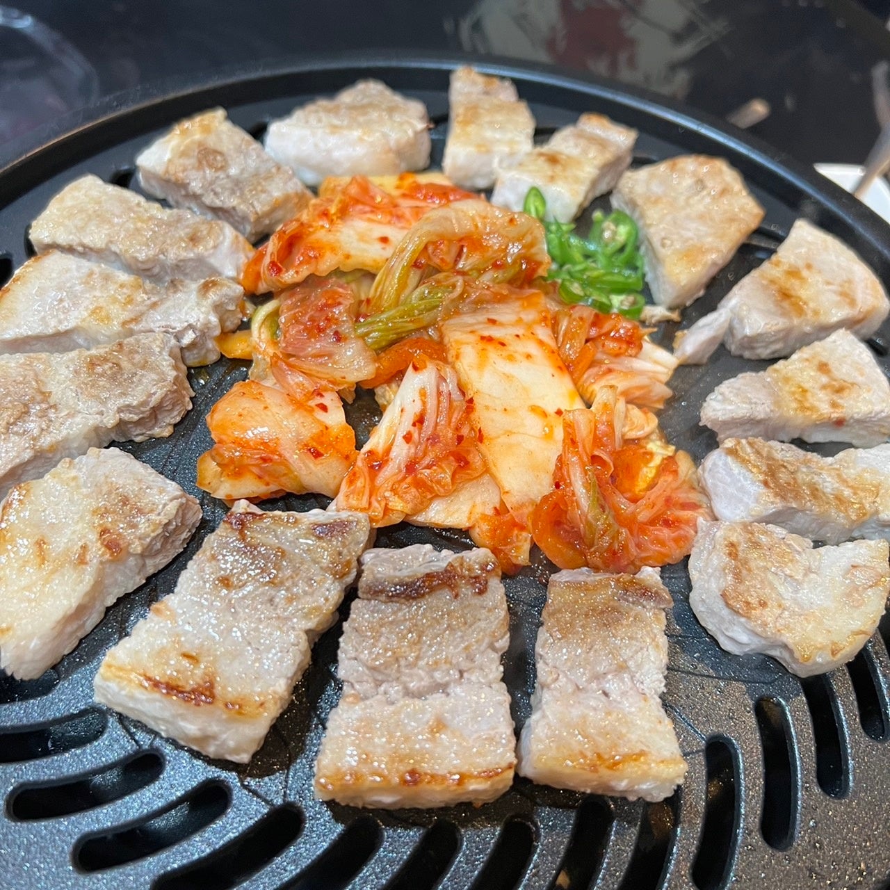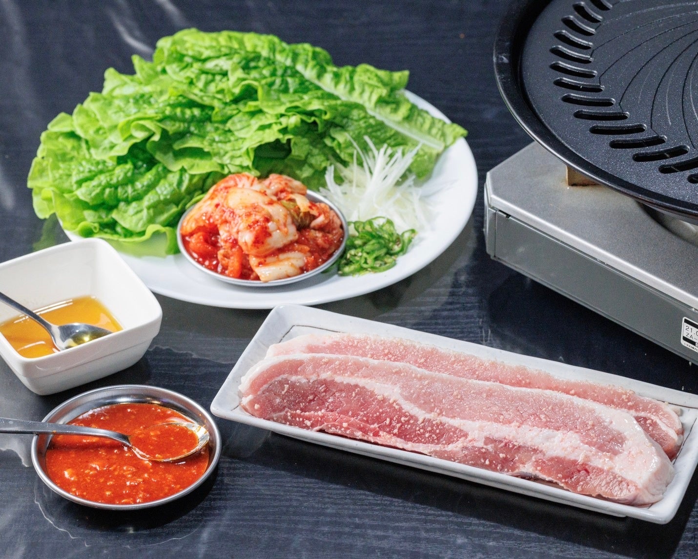 焼けたお肉をキムチやネギと一緒にサンチュに巻いてお召し上がりください。