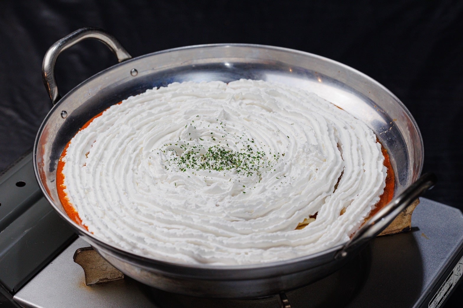 まにぽぽの『ロゼトッポギ』は、辛みを利かせたトマトベースのトッポギの上に、生クリームを渦巻き状にかけて提供いたします。生クリームがソースの辛さを和らげ、クリーミーで濃厚なコクの中にマイルドな辛さを感じる一品です。ソースの中にはモチモチ食感のトッポギやソーセージなど具だくさん。